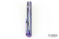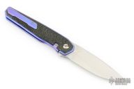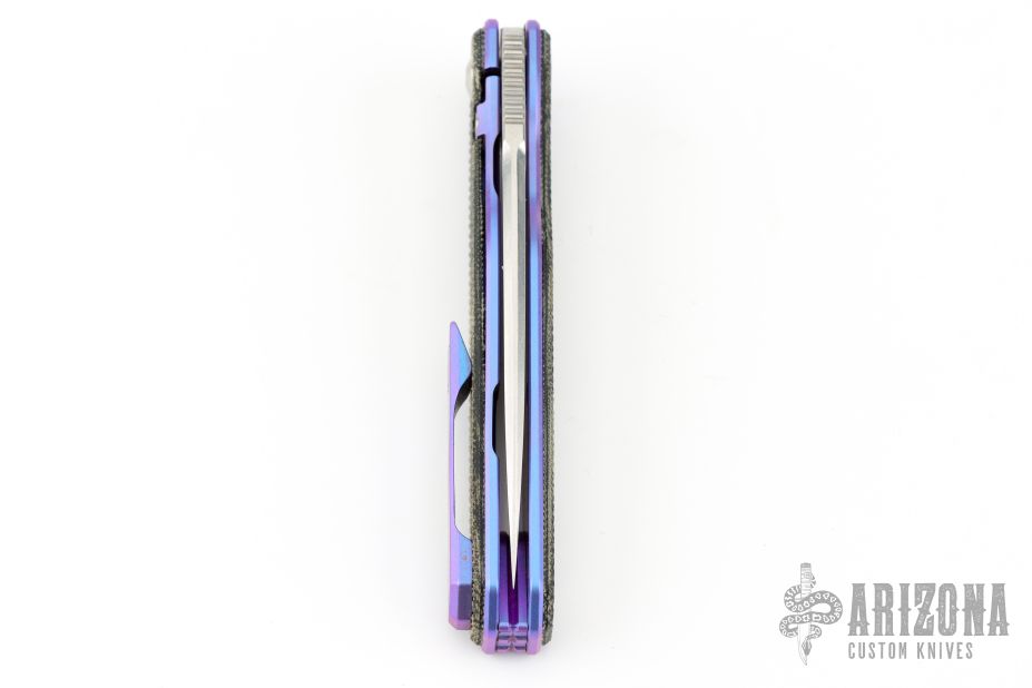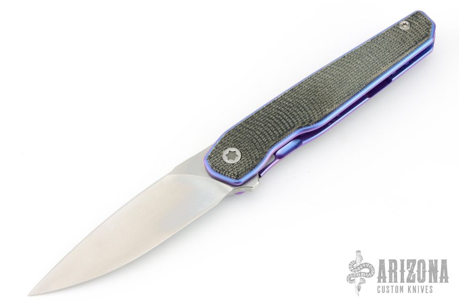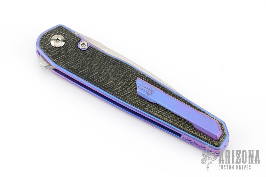 This LHC-X by Brown Knives features a drop point stonewashed blade with notched thumbrest and flipper. The handle has black canvas micarta scales, anodized titanium liners, backspacer and tip up clip with hidden screws. Rides on bearings, nice detent, lockup and blade seating. Comes with original box and COA #133. Excellent condition.