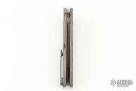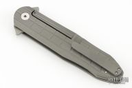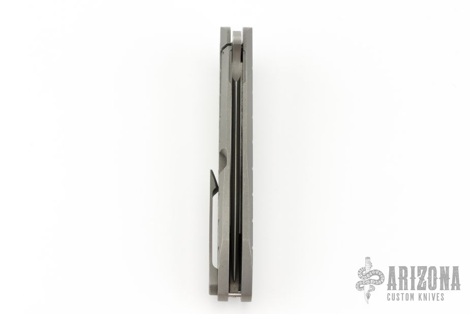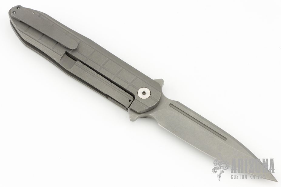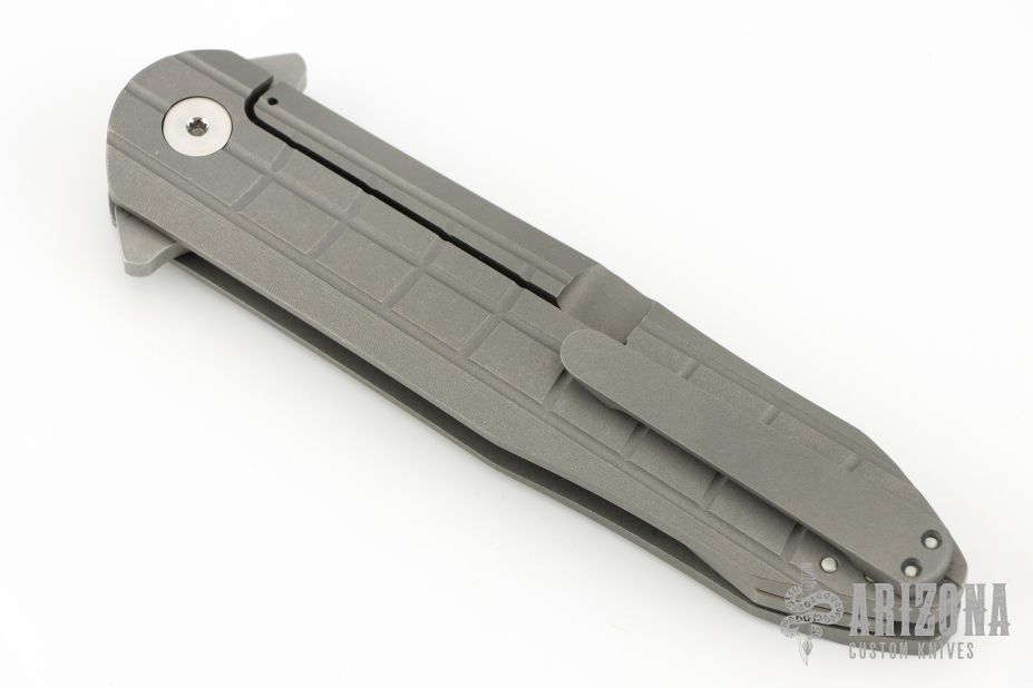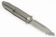 This Repentance flipper by Turpin Knives features a bead blasted and tumbled blade with false top edge, fuller and flipper. The handle has a milled and tumble finished titanium frame with a bead blasted titanium tip up clip and a titanium and carbon fiber 3-piece backspacer. Lanyard pin at the butt. Nice detent, lockup, blade seating and action. Comes with a zippered caes. Has a few light scuffs, otherwise excellent condition.
