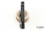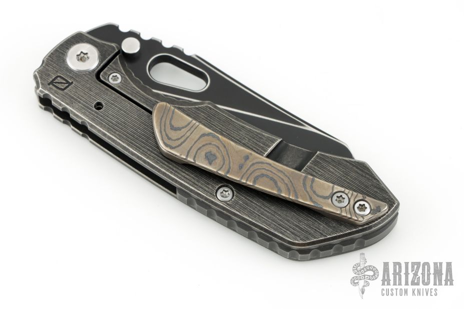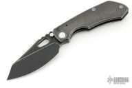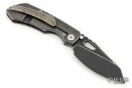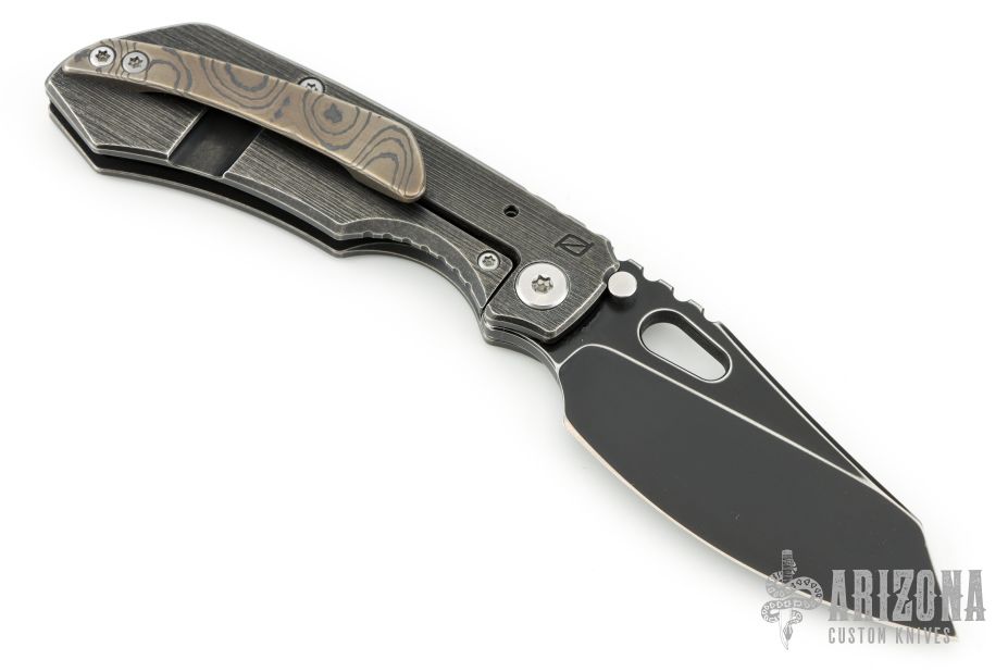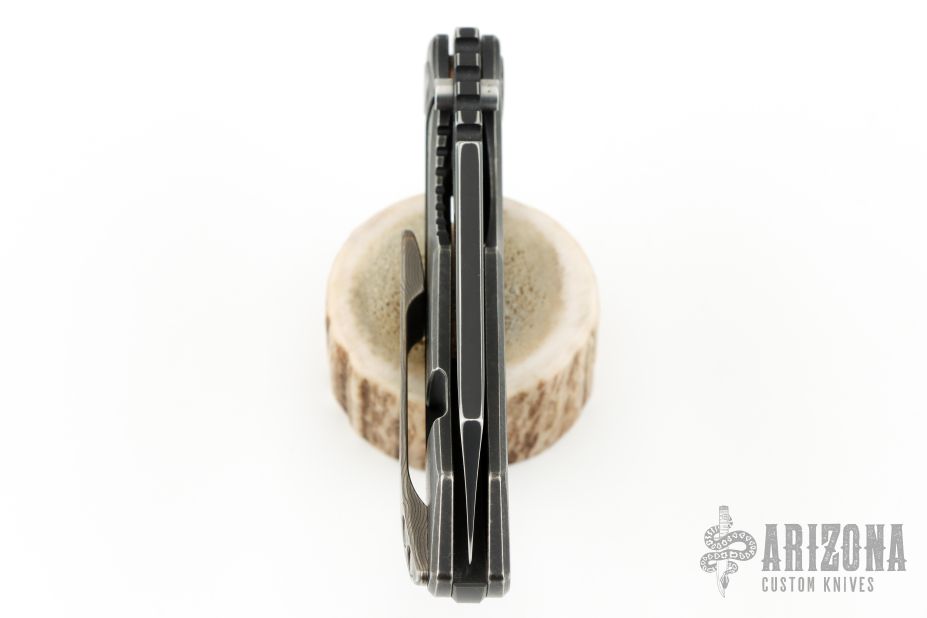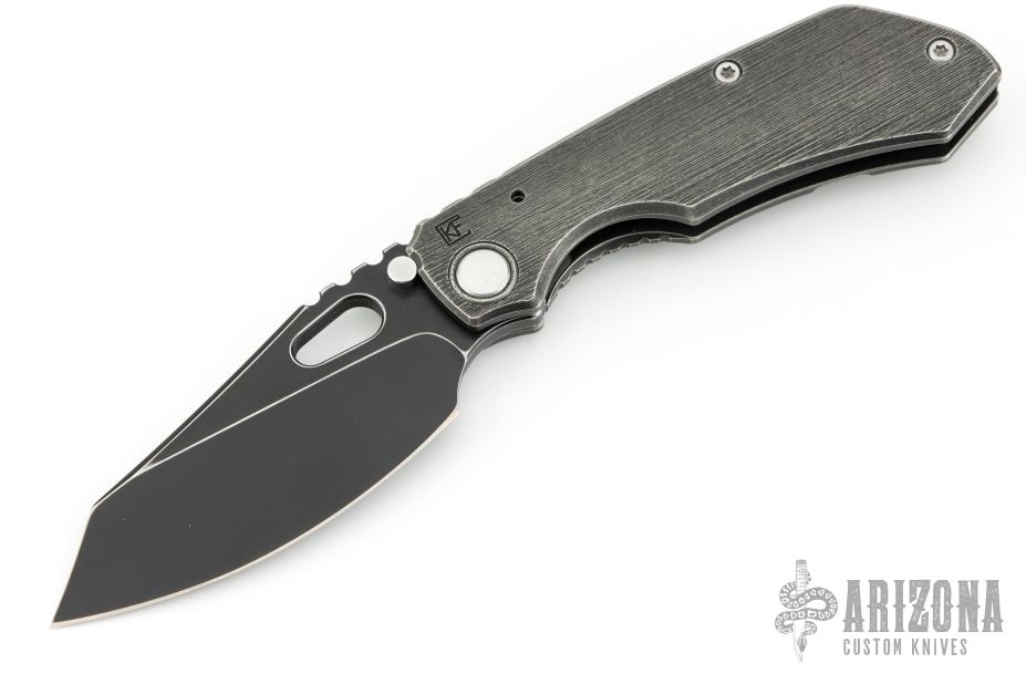 This Evolution 2.0 by Custom Knife Factory features a custom black cerakoted blade with notched thumbrest and thumbhole. The handle has a stonewashed bark finished titanium frame with a matching backspacer. ZircuTi pivot collar and tip up clip. Comes with velcro case and COA dated 1/21 and #89. Nice detent, lockup and blade seating. Excellent Condition.