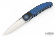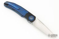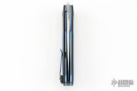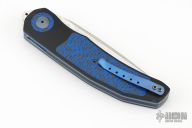 This D3 by J.A. Basson features a satin finished blade with mirror polished flats, notched thumbrest and front flipper. The blade has been custom reground by BGM. The handle has black G-10 scales with black/blue carbon fiber inlays, orange peel finished and anodized titanium liners and tip up clip, black G-10 backspacers. Rides on ceramic IKBS, nice detent, lockup and blade stock. Comes with a zippered case and COA dated July 2022. Excellent condition.