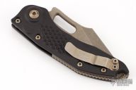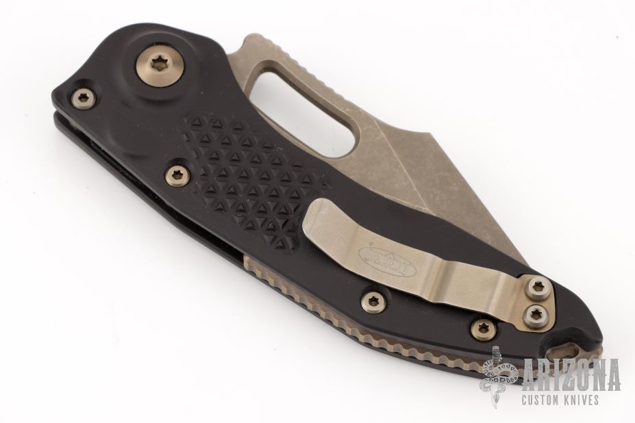 This Stitch Auto by Microtech Knives features a bronzed and tumble finished blade and false top edge, notched thumb and finger rests. The handle has a black anodized and milled aluminum handle with a bronzed titanium backspacer and stainless steel clip, tip up carry, lanyard hole at the butt. Comes with original box and papers dated 07/2017 and S/N 1997. Has a couple light scuffs and scratches, great condition otherwise.