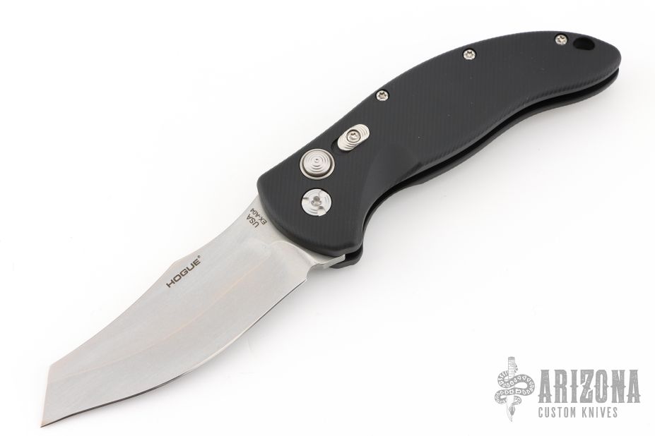 The Hogue Extreme EX-A04 series is an Allen Elishewitz design that is reminiscent of his custom Hyde knife. This EX-A04 is the Automatic version of the original. The blade is quickly deployed with the firing button and stays securely in place with the plunge-lock and manual safety. The blade features two hollow ground bevels, which add plenty of visual interest while maintaining utility. The handle is perfectly contoured for the ultimate grip and comes with a tip-down carry pocket clip.