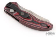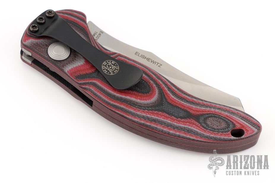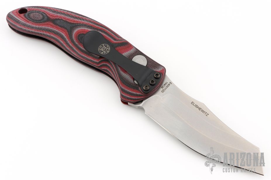 This Elishewitz design auto features a stonewashed recurve blade. The handle has black/grey/red G-10 frame with safety. Has black stainless steel pocket clip and lanyard at the butt. Excellent condition. Comes with original box, papers and zippered case.