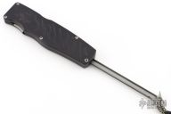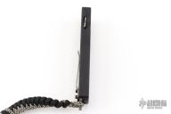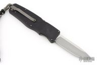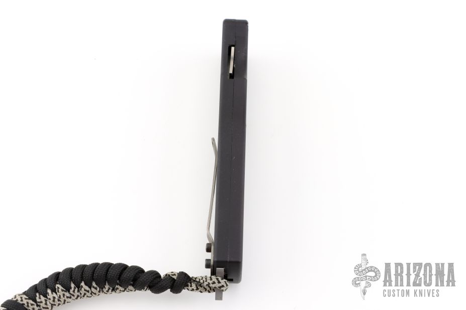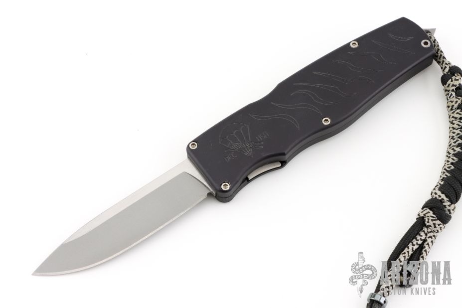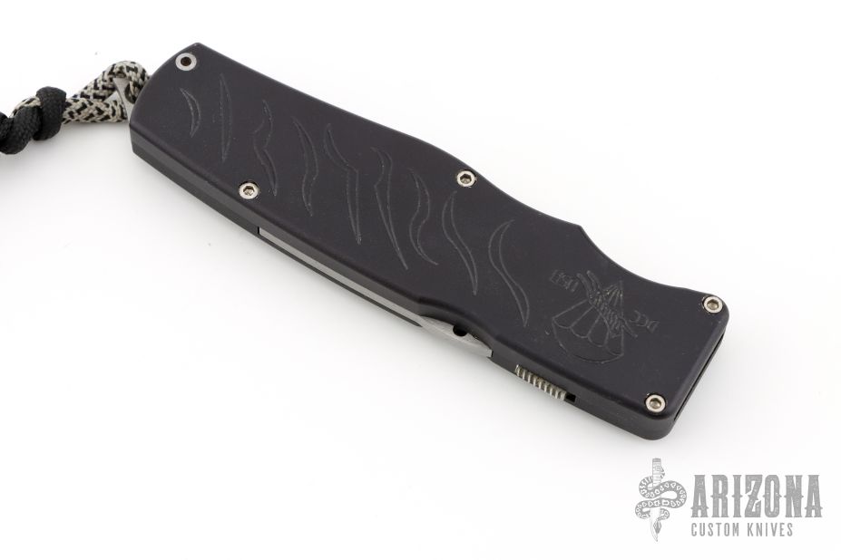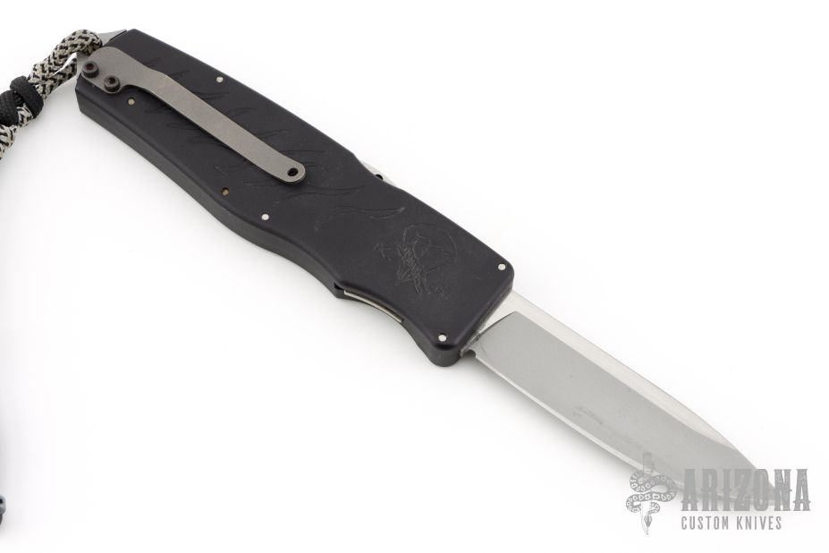 This Green Safe-to-Carry (STC) Asp OTF by Rob Dalton opens by pressing forward on the safety and down on the bar on the handle spine. The knife closes by pressing the locking mechanism on the opposite side and pulling the charging handle on the rear half way then pressing the safety forward and the release bar down at the same time while pulling the charging handle the rest of the way. Very strong and fast opening. The blade is a clip point and is bead blasted. The handle is black aluminum with a tip down bead blasted titanium clip. Has a couple light scuffs, otherwise excellent condition.