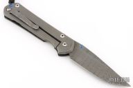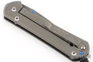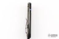 This large sebenza 21 features a Devin Thomas Ladder Pattern Stainless Damascus blade with single titanium thumbstud and a notched thumbrest. The handle is bead blasted titanium with carbon fiber show side and titanium standoff and lanyard pin. Strong lock up, nice detent and blade seating is dead center. Includes original box, leather slip sheath and paperwork dated May 30th, 2017. Has some scuffs and scratches, otherwise good condition.