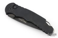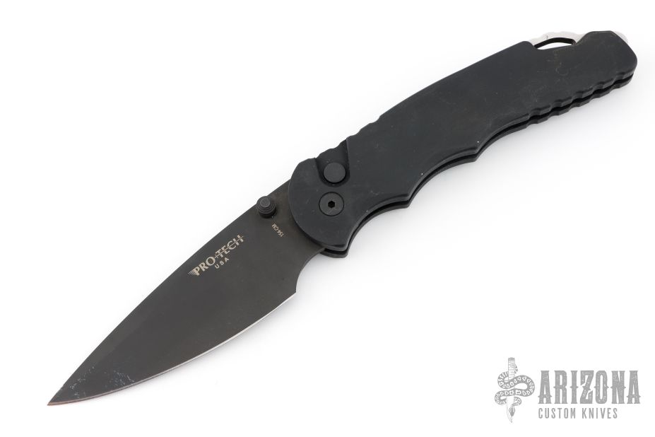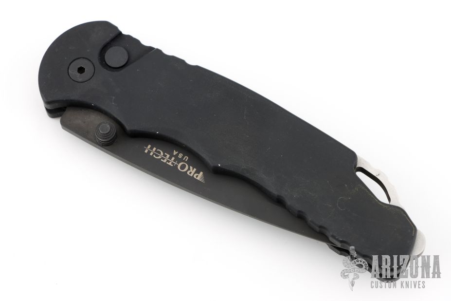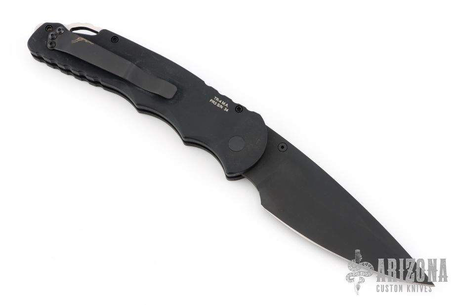 This Tactical Response 4 Manual by Pro-Tech has a black blade with a plain edge, and a black aluminum handle. Black stainless steel clip. Steel glass breaker. Comes with a Protech box (for a TR-4.3 auto), sheath and papers. PR3, serial number 34. Has some scuffs and scratches, otherwise good condition. The button must be pressed to open and close.