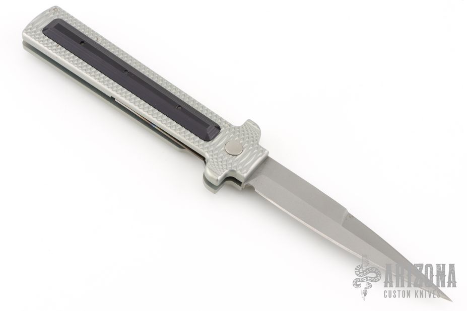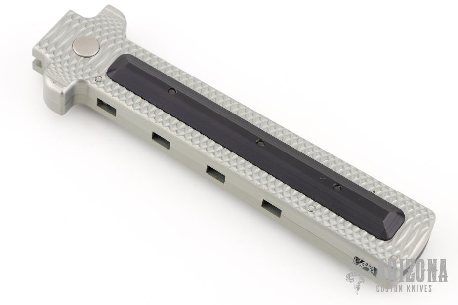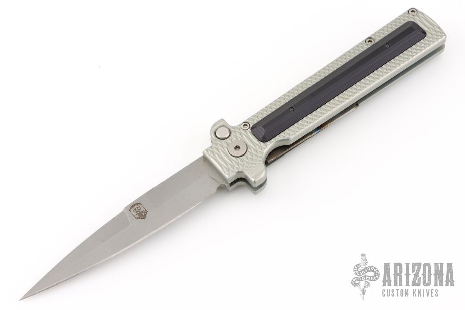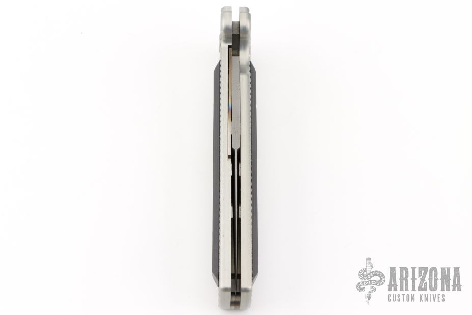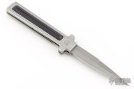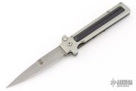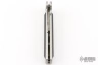 This Companion Model 1 from Rob Dalton features a bead blasted bayonet ground dagger style blade with false top edge. The handle is comprised milled silver aluminum frame with black aluminum overlay. Has a couple light scuffs, otherwise excellent condition. Nice lockup, action and blade seating.