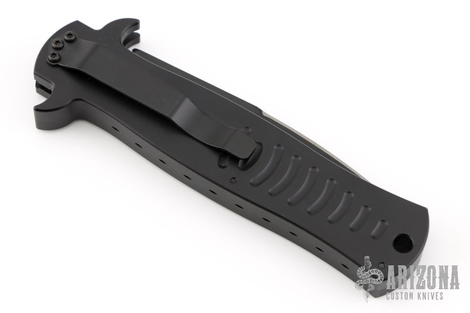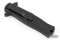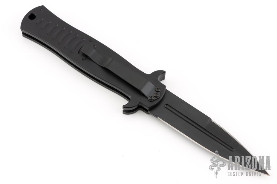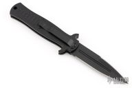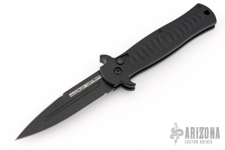 This collaboration between Darrel Ralph and Ryan Wilson of Wilson Tactical is the Stiletto Auto with black aluminum handle. Black coated blade with blood groove in the center and a ground but not sharpened top edge. Smooth firing auto with a strong lock up. Excellent condition.