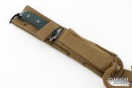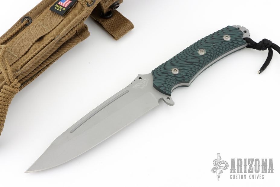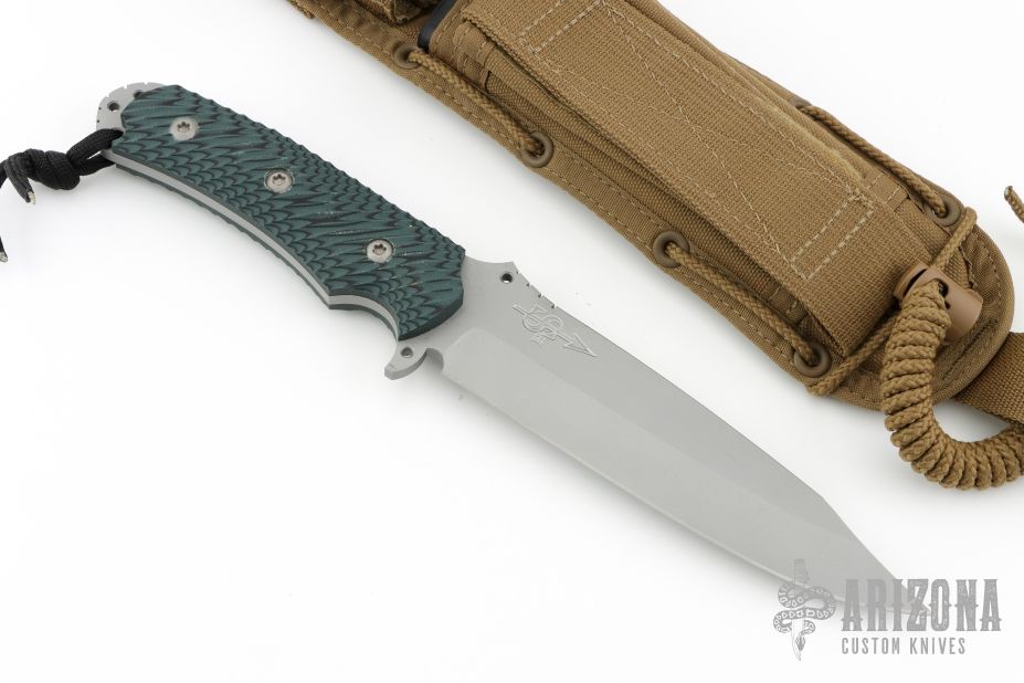 This Hide Fighter by Steve Woods features a bead blasted blade with a fuller on one side, .181" blade stock and 1.63" blade depth, full tang construction. The handle has black/green G-10 scales. Comes with nylon belt sheath. Has some light scuffs and patina. Excellent condition otherwise.