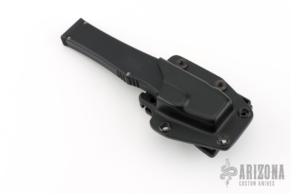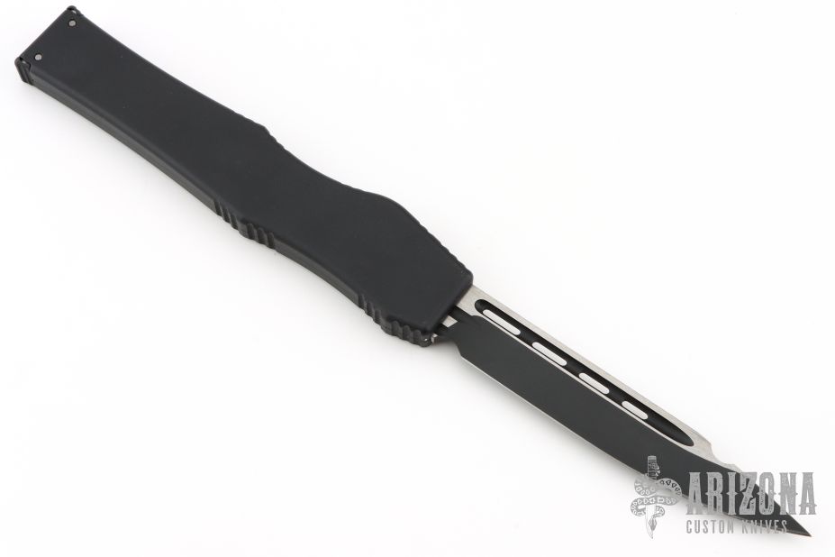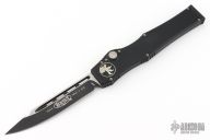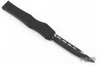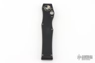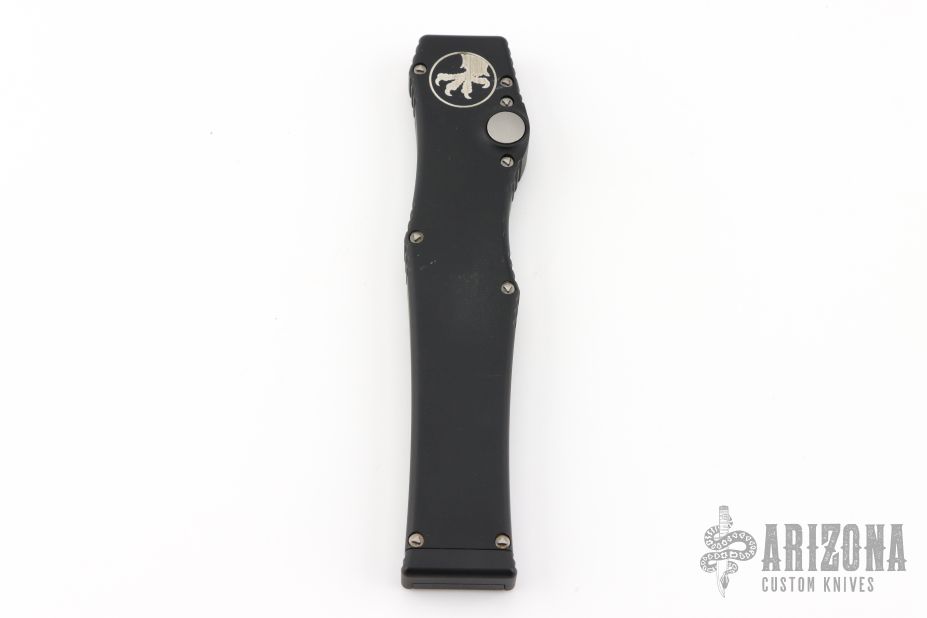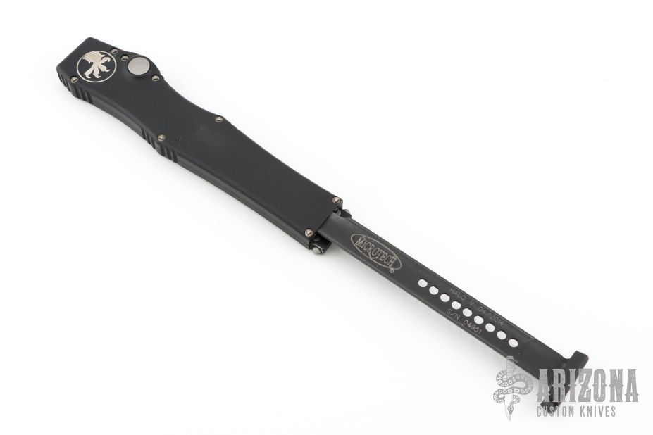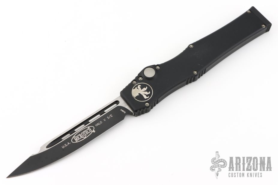 This Halo V OTF automatic features a black clip point blade with a single edge. The handle is black aluminum. Push button release. Charging handle is marked "Microtech", dated 04/2014 and S/N 04951. Comes with original box, papers and sheath. Has some scuffs, otherwise excellent condition. Dated 04/2014 and s/n 04591