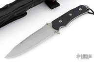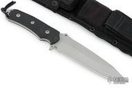 This Hide Fighter by Steve Woods features a bead blasted blade with a fuller on one side, .181" blade stock and 1.63" blade depth, full tang construction. The handle has black G-10 scales. Comes with nylon belt sheath. Has some light scuffs and patina. Excellent condition otherwise.