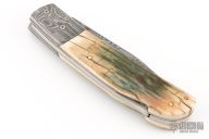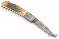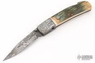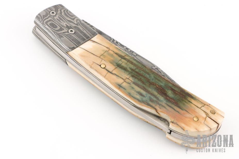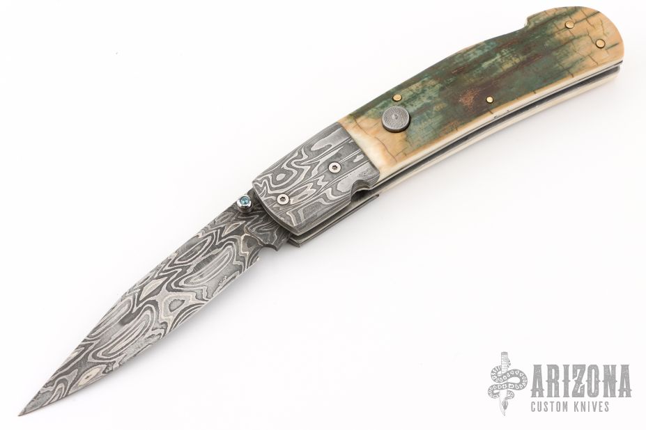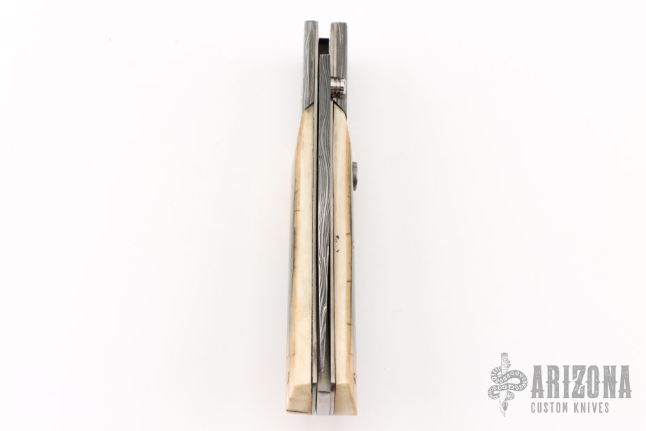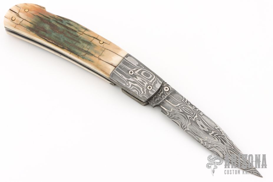 This D/A Auto features a Damascus blade with single thumbstud with a light blue stone inlay. The handle has dovetailed Damascus bolsters, mammoth ivory scales, Damascus push button, titanium liners, stainless steel backspacer. Nice action and lockup. Has a few light scuffs, otherwise excellent condition. Comes with a zippered case.