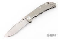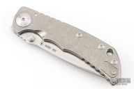 This framelock folder by Spartan Blades features a stonewashed drop point blade with dual thumbstuds and a notched thumbrest. The handle has a stonewashed titanium frame with tip up titanium clip. Has nice detent, lockup, and blade seating. Comes with original box. Excellent condition. Blade is singed by Bill Harsey and dated 2016