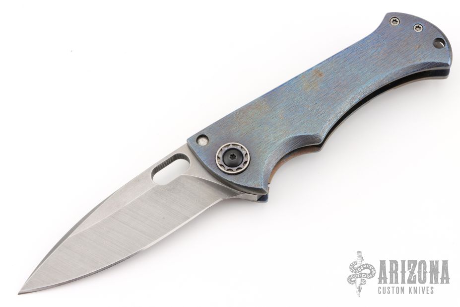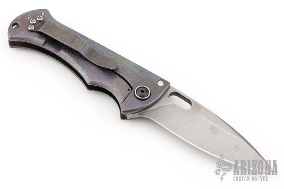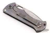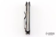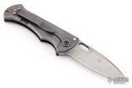 This Tracker Dan Bloodshark by John Gray is a collaboration with Tracker Dan, it features a satin finished blade with thumbhole, .196" blade stock. The handle has an anodized and bark finished titanium frame with titanium pivot collars, and a three hole tip up clip. Nice detent, lockup and blade seating. Comes with a zippered case. Excellent condition.