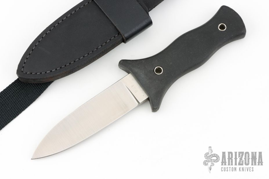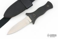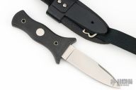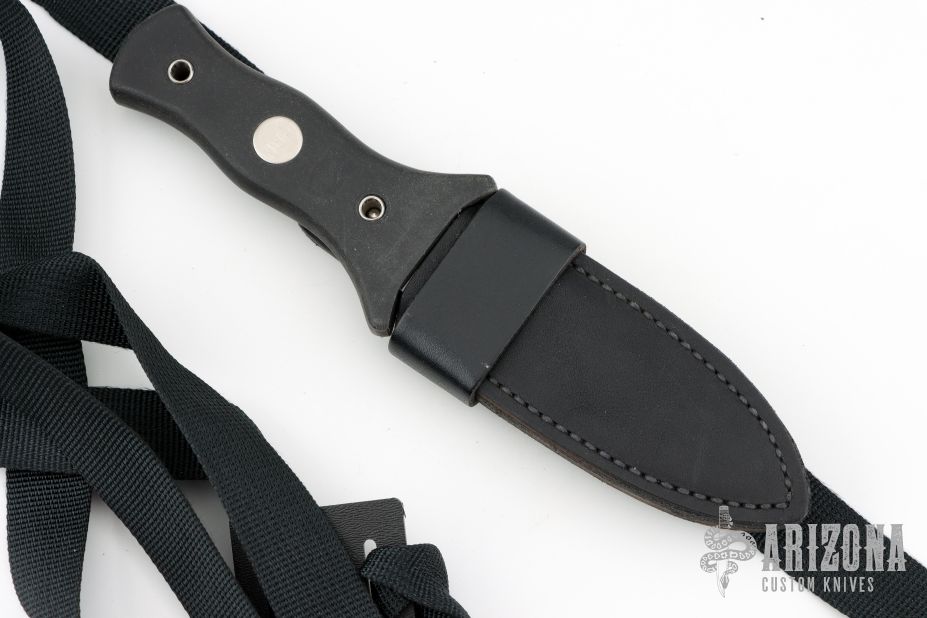 This Ninja by Benchmark Knives features a satin finished spear point blade with false top edge, .186" blade stock and .991" blade depth, hidden tang construction. The handle is black zytel. Comes with the original box, papers and black leather sheath with shoulder harness. Excellent condition. The blade is marked "Benchmark" and "4350".