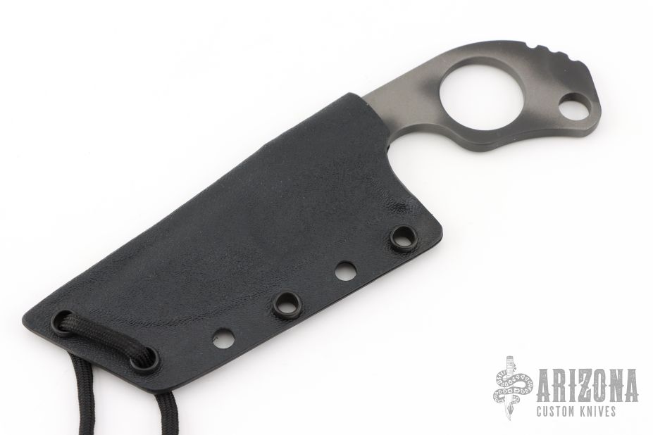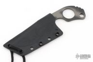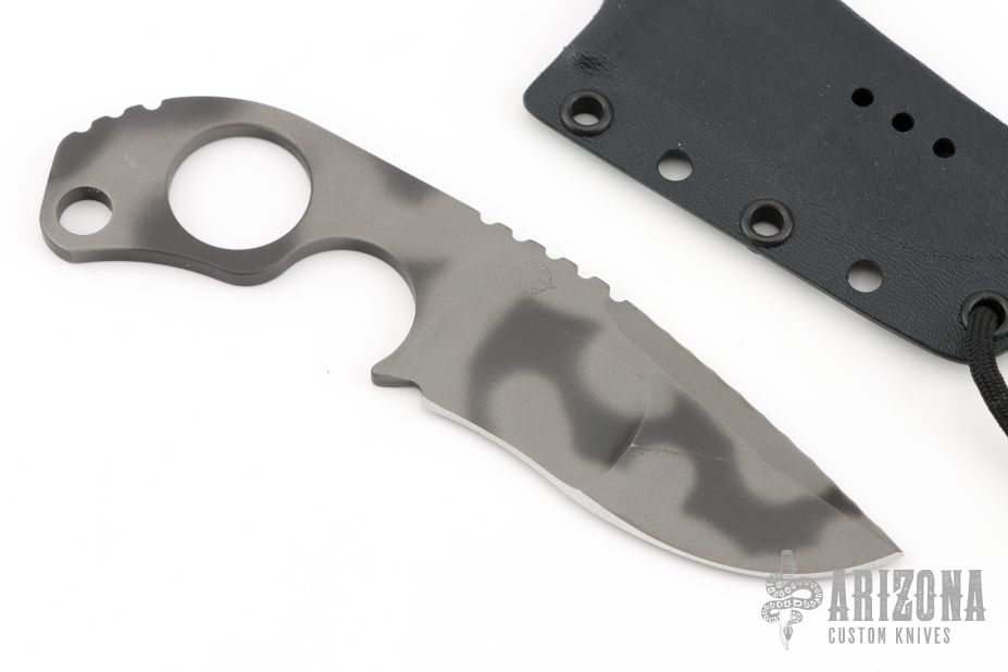 This SLCC by Mick Strider features a tiger striped duplex-grind recurve blade with a notched thumbrest, dragon spine file work on blade spine, .192" blade stock and 1.497" blade depth. The handle has a finger groove and ring. Comes with a kydex sheath. Has some scuffs and scratches great condition otherwise.