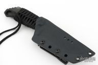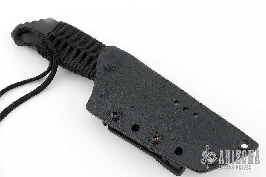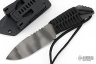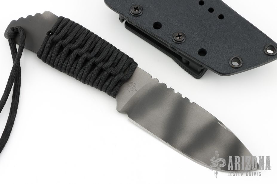 This knife by Mick Strider features a tiger striped drop point blade with a notched thumbrest, .193" blade stock and 1.371" blade depth, full tang construction. The handle has a cord-wrapped grip. Comes with a kydex sheath.  Has scuffs and scratches, great condition otherwise.