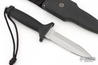 This is a Gerber/BenchMark TAC-I Military Survival Knife with the locking sheath. The blade is double edged and double serrated. Blade is 1/8" thick and 1" in depth. Blackie Collins is the designer. The handles on the TAC-I is molded Zytel, full-hidden-tang. Comes with original sheath. Has some sheath marks, otherwise excellent condition.