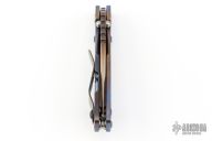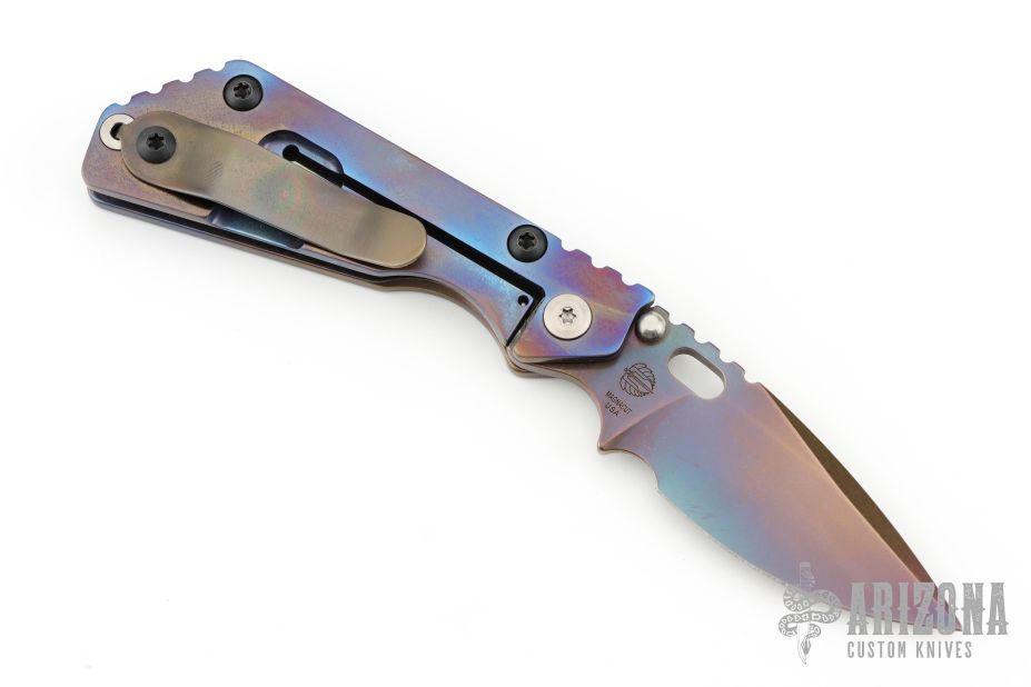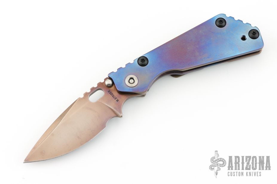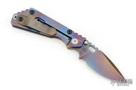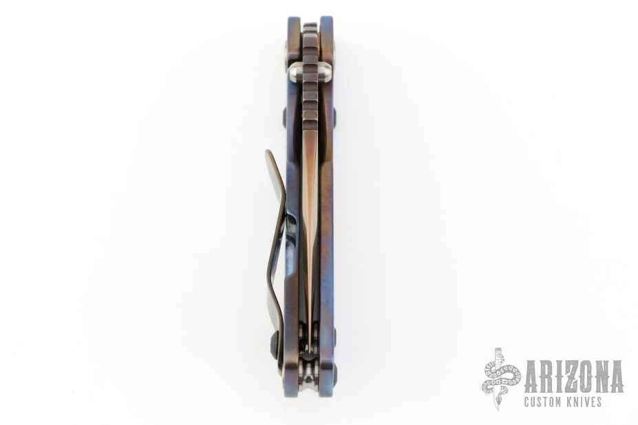 This PT by Mick Strider features a black blade with notched thumbrest and thumbhole. The handle has an orange peel finished and anodized titanium frame with matching tip up clip. New from maker.