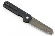 This Slimfoot Auto has a black anodized aluminum handle and a Damascus blade with black lip pearl inlay on push button.