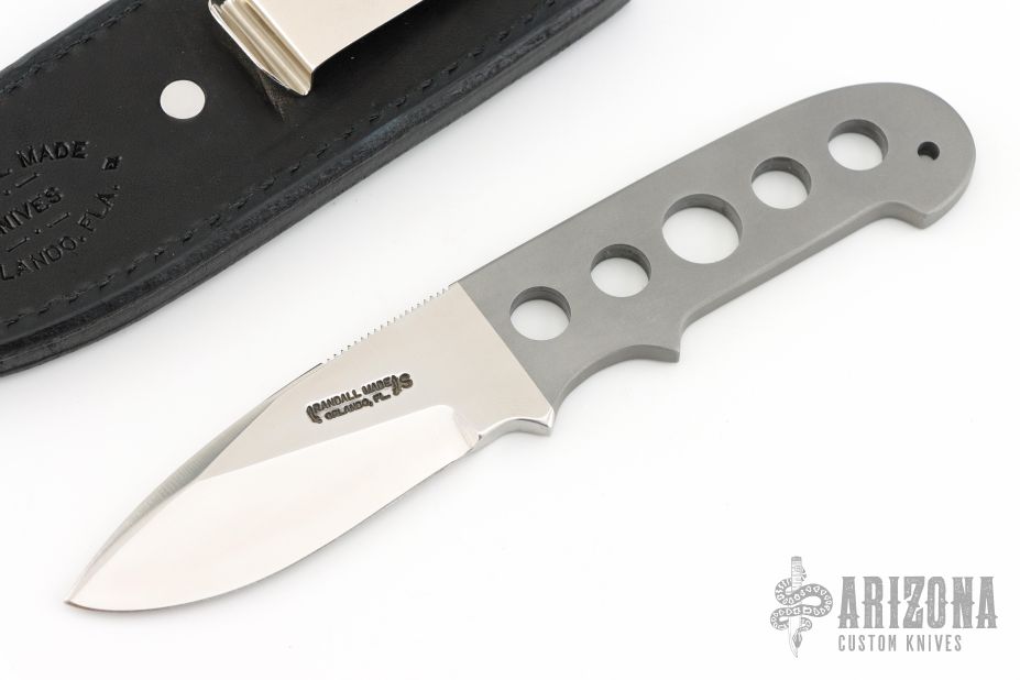 The Triathlete is a non-catalog knife by Randall Made Knives. It has a satin finished blade with notched thumbrest, .184" blade stock and 1.011" blade depth, integral construction. Notched thumbrest. Bead blast handle. Comes with black leather sheath with belt clip and original paper wrapping. New from maker.