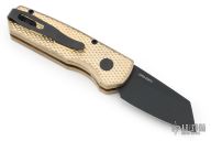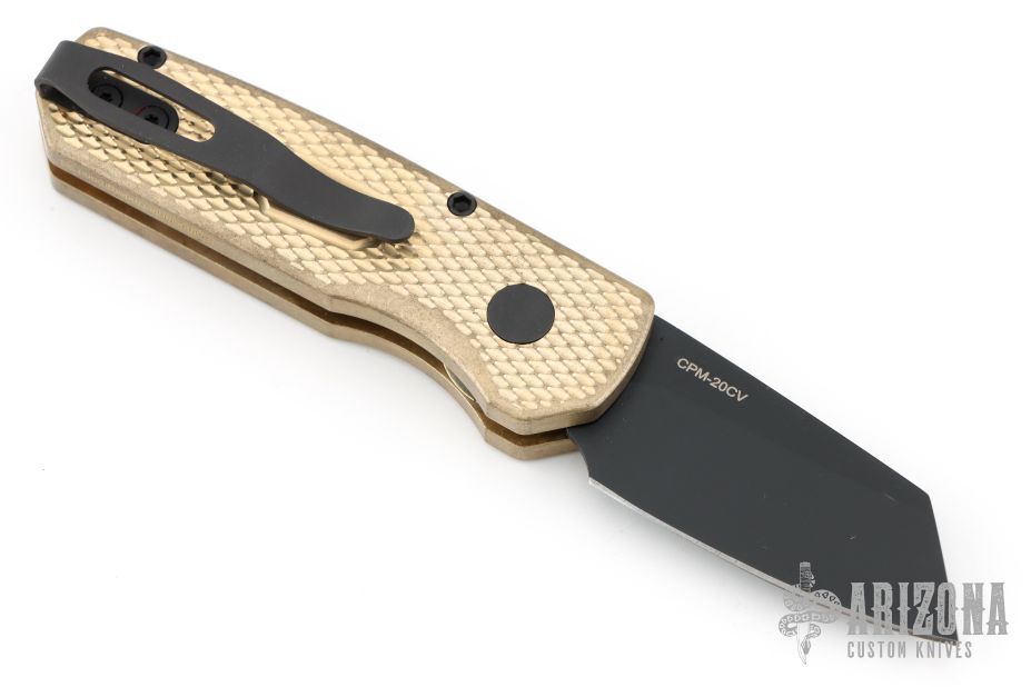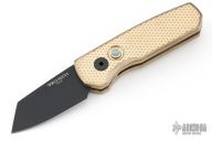 This Runt by Pro-Tech features a black wharncliffe blade.  The handle features a textured bronze aluminum frame with milled thumbrest, a black stainless steel tip up pocket clip and a mother-of-pearl push button.  Marked: "Enthusiast Underground '21" on the finger choil. Comes with original box, pouch, and papers. Has some light scuffs, and patina. Excellent condition otherwise.