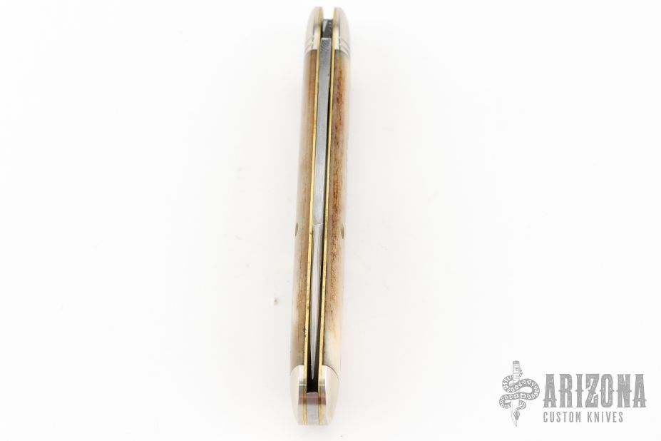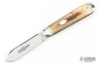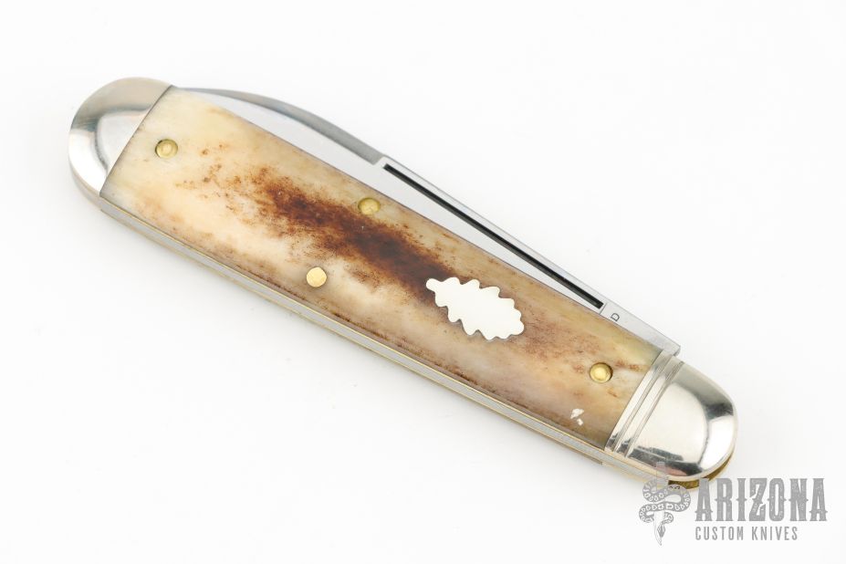 This American Jack by Great Eastern Cutlery features a satin finished blade with nick and swedge. The handle has nickel silver bolsters and butt, Smooth Appaloosa Bone covers with brass liners, and a stainless steel spring. Has half-stop, flush in the open and closed positions. Comes with original tube. Excellent condition. 100 made