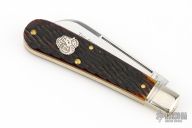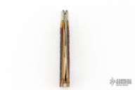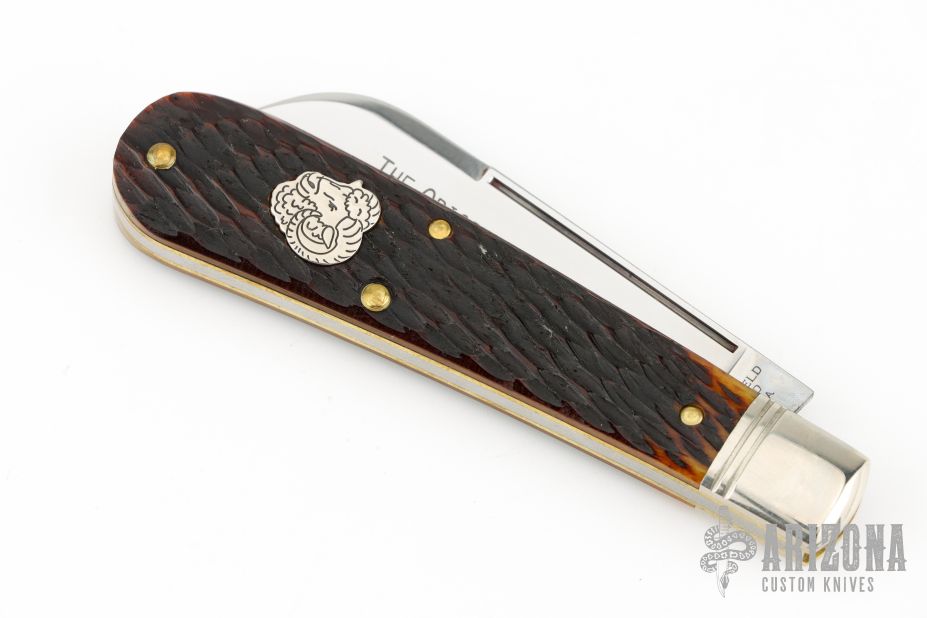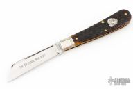 This Swayback by Great Eastern Cutlery features mirror finished wharncliffe blade with nail nick. The handle has fluted nickel silver bolsters, Antique Autumn Jigged Bone covers with a nickel silver, brass pins and liners, stainless steel spring. Has half-stop. Comes with original tube. Excellent condition.