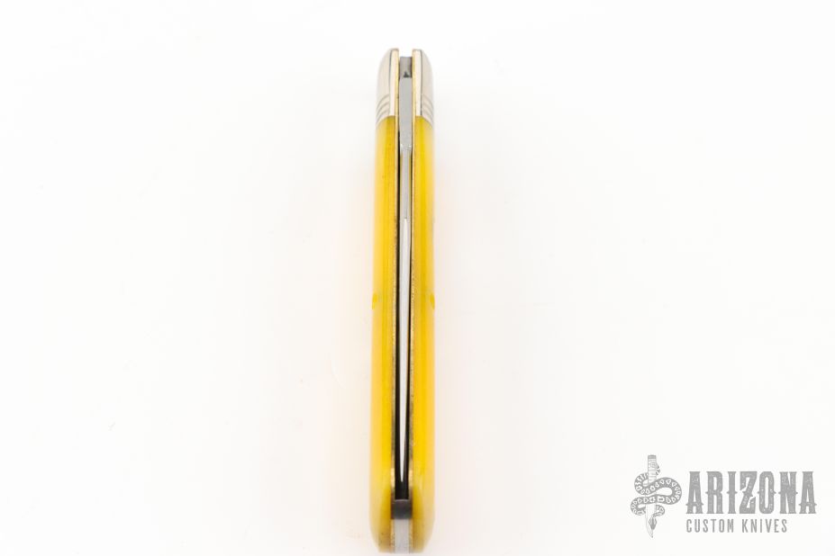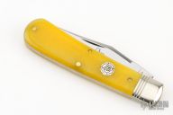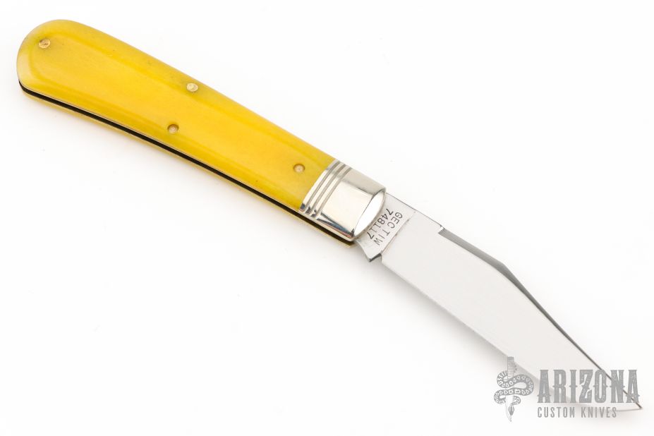 This Stallion by Northfield Knives features a polished blade with nail nick. The handle has nickel silver fluted bolsters, yellow bone covers with brass liners/pins, steel spring. Has half-stop.  Comes with original tube. Excellent condition. 273 Made.
