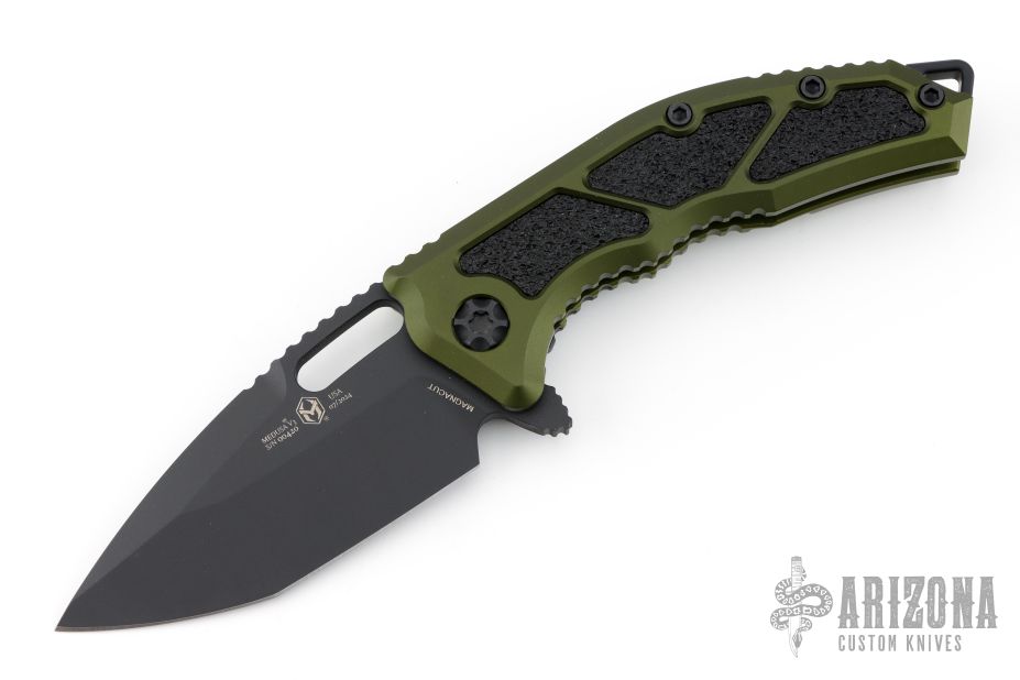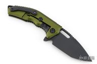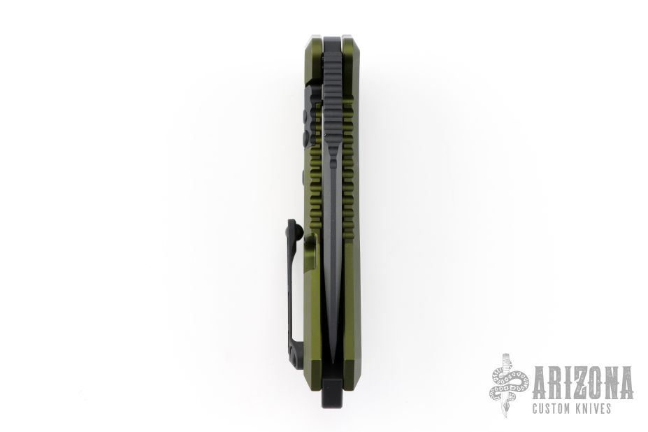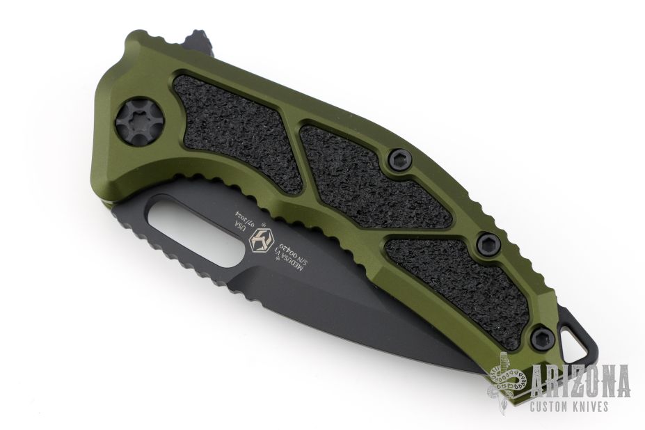 This Medusa Manual by Heretic Knives features a black tanto blade with false top edge, notched thumbrest and flipper. The handle has a green aluminum frame with checkered push button, black backspacer and a tip up stainless steel clip with ceramic ball. Comes with original box and drawstring bag. S/N 00420, dated 07/2024.  Excellent Condition.