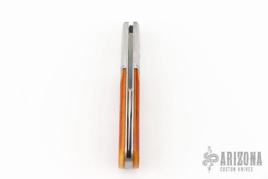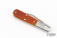 This slipjoint by Great Eastern Cutlery features a satin finished blade with a nail nick. The handle has fluted stainless steel bolsters, brass liners, Goldenrod Sawcut Bone covers, stainless steel spring. Has half stop. Comes with original tube. Excellent condition.