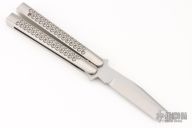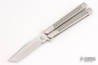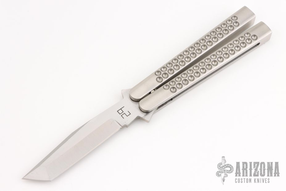 This Balisong by 29 Knives features a satin finished tanto blade with flat clip, concave ramps and satin finished 303 stainless steel ball mill pattern handles. Excellent work. Has a few very light scratches, otherwise excellent condition. Comes with original box, zipper pouch, warranty, and handwritten specifications.