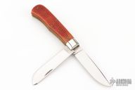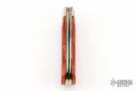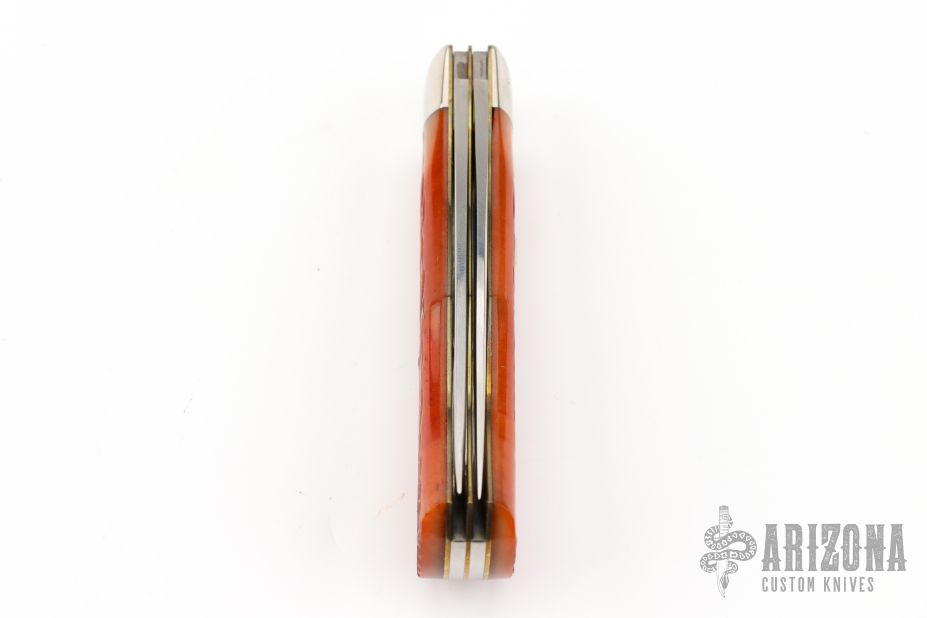 This knife by Cripple Creek has 2 mirror finished blades with nail nicks. The handle has nickel silver bolsters, orange pick bone scales, brass liners and stainless steel springs. Excellent condition. Comes with original tube.
