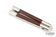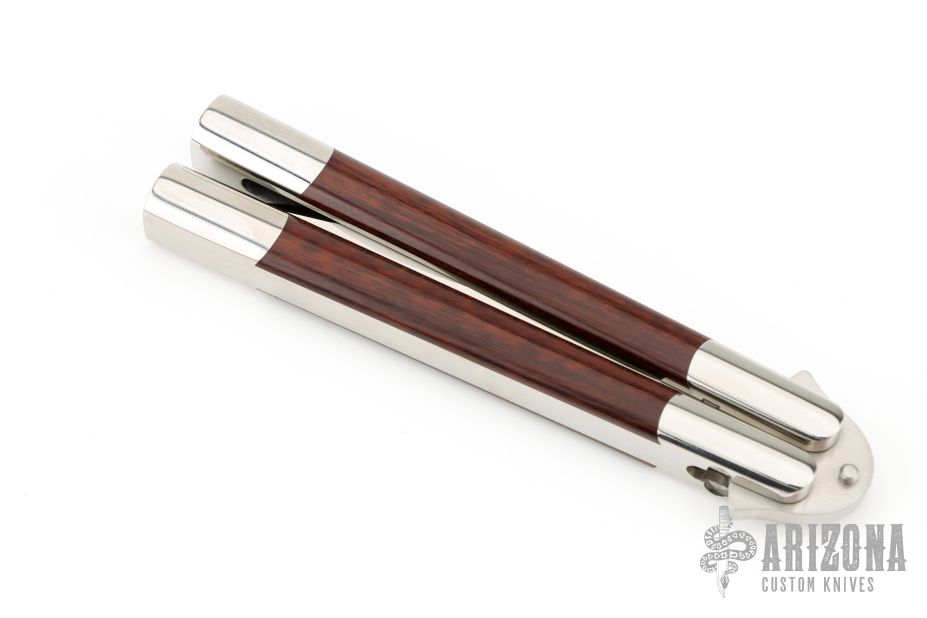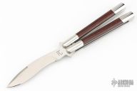 This balisong by 29 Knives features a satin finished blade with false top edge. The handle has integral 303 stainless steel handles with dovetailed red snakewood Inlays. Includes a padded zippered case and COA. Has a few very light scratches, otherwise excellent condition.