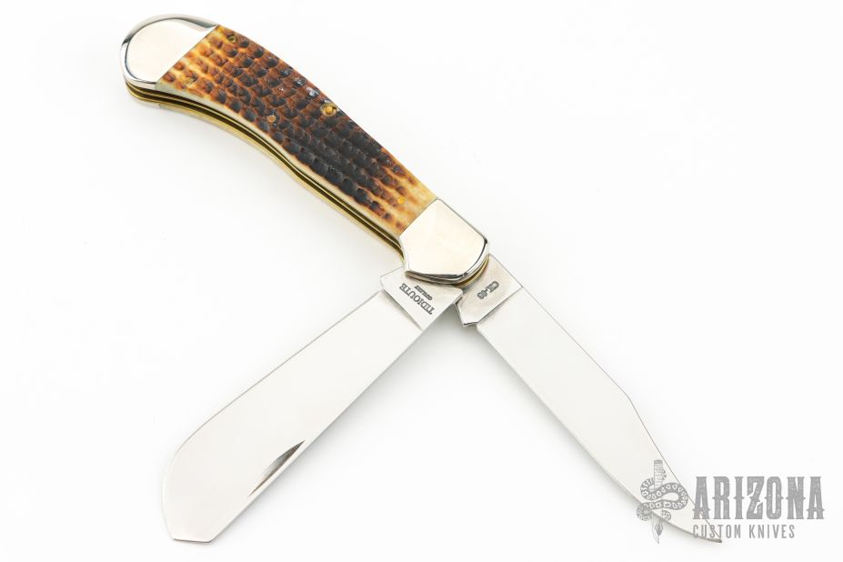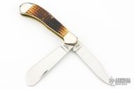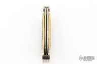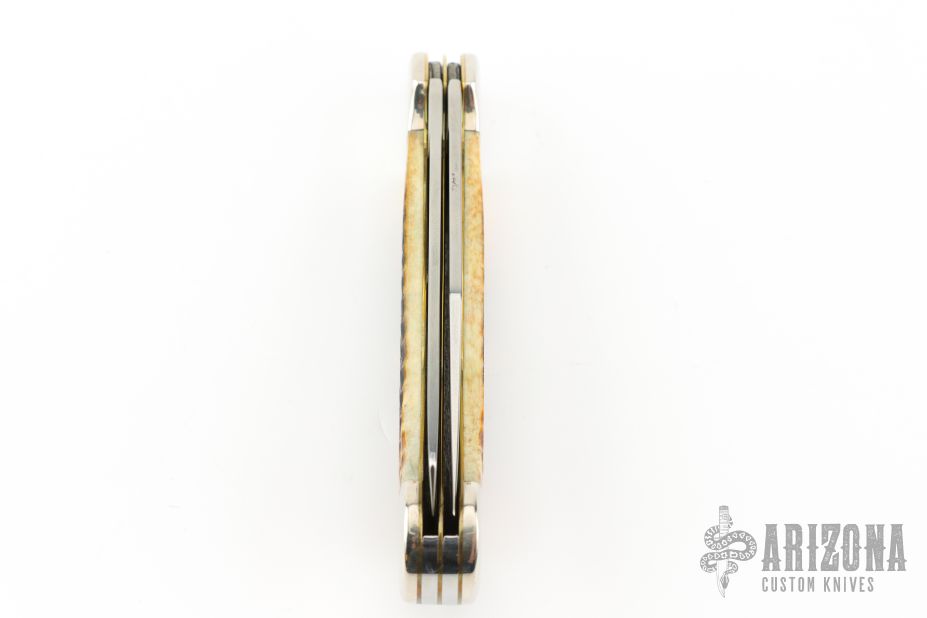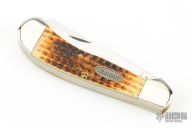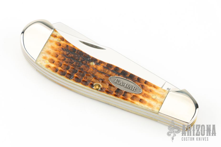 This Ka-Bar slipjoint is dated 2003. It has a mirror polished blades with nail nicks. The handle has nickel silver bolsters, jigged bone scales, brass liners, and stainless steel springs. Has half-stops. Excellent condition. Comes with original box.