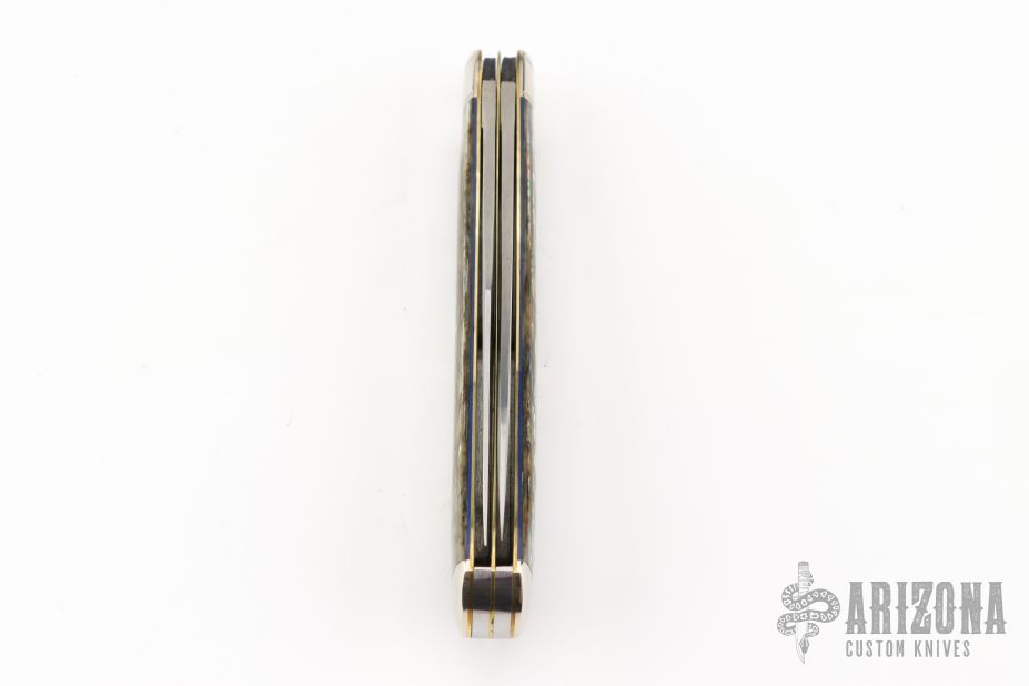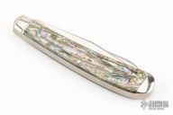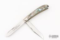 This Winchester folder features two mirror polished blades. Nickel Silver front and rear bolsters with abalone covers. Brass liners and steel spring. Comes with original box and papers. Excellent condition. #065.