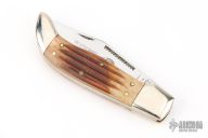 This slipjoint by Parker Cutlery Company has a mirror finished blade with nail nick. The handle has nickel silver bolsters, jigged bone covers, brass liners, stainless steel backspacer. Has some light scratches, otherwise excellent condition. Comes with original box.