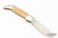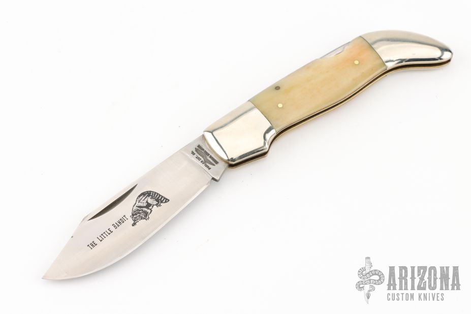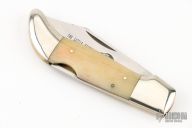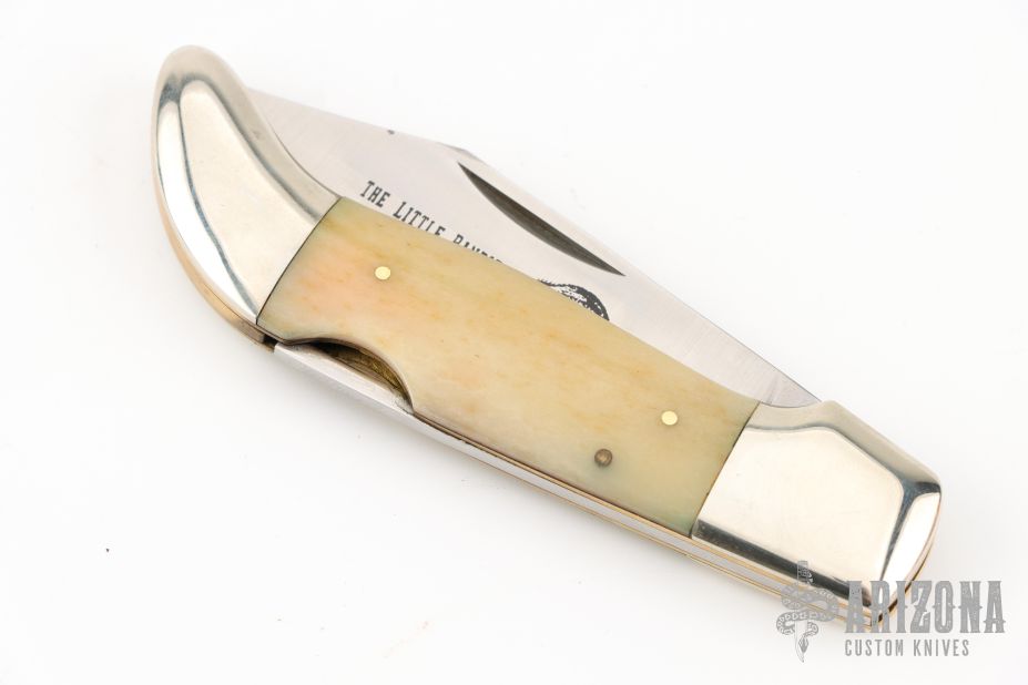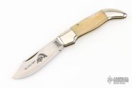 This lockback by Parker Cutlery Company has a satin finished blade with nail nick. The handle has nickel silver bolsters, white bone covers, brass liners, stainless steel backspacer. Has some light scratches, otherwise excellent condition. Comes with original box.