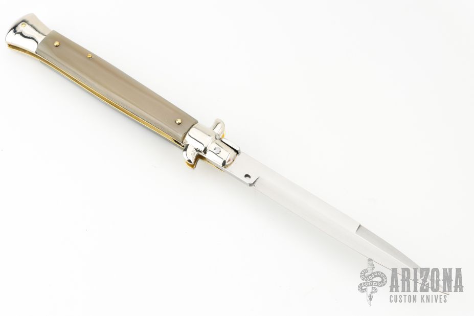 This 11" Picklock Auto by Frank Beltrame features a tumbled bayonet ground blade with false top edge. The handle has nickel silver bolsters, front and rear, buffalo horn scales, brass liners, stainless spring. Comes in Campolin leather sheath. Excellent condition.  This one was tuned and polished by Greg's Effects and has a COA.