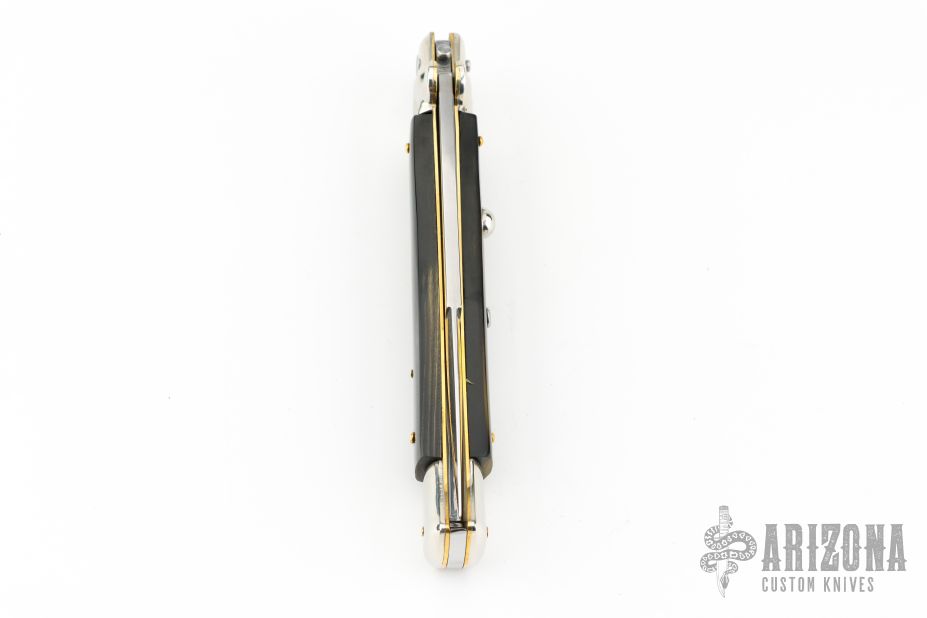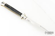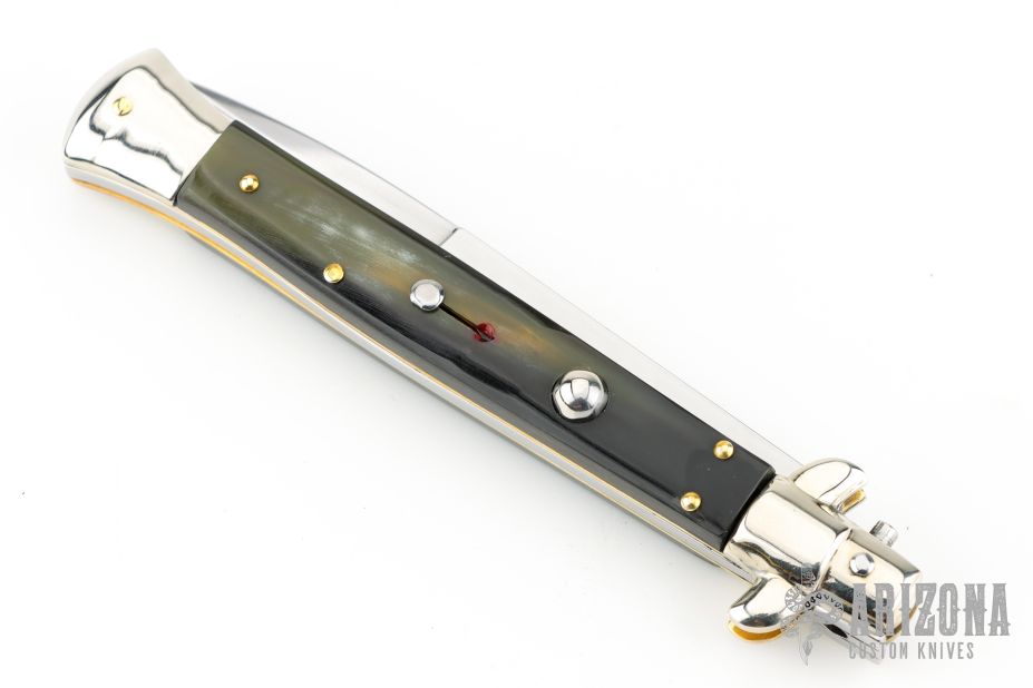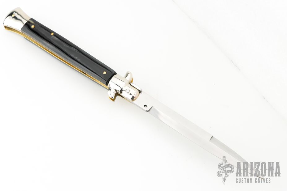 This 11" Picklock Auto by Frank Beltrame features a tumbled bayonet ground blade with false top edge. The handle has nickel silver bolsters, front and rear, buffalo horn scales, brass liners, stainless spring. Comes in Campolin leather sheath. Excellent condition.  This one was tuned and polished by Greg's Effects and has a COA.