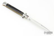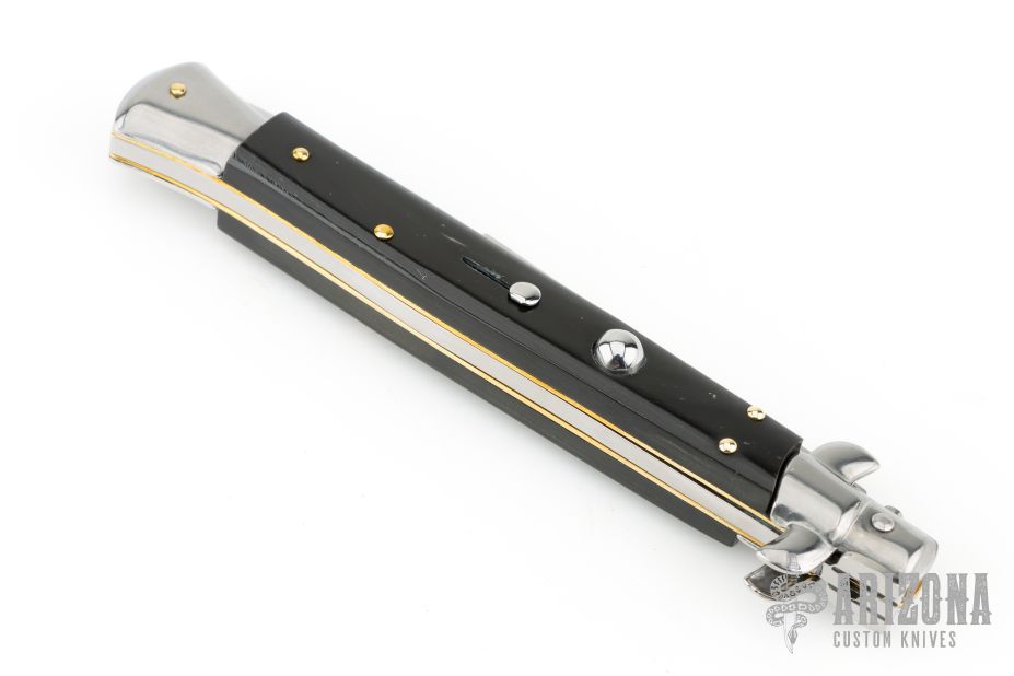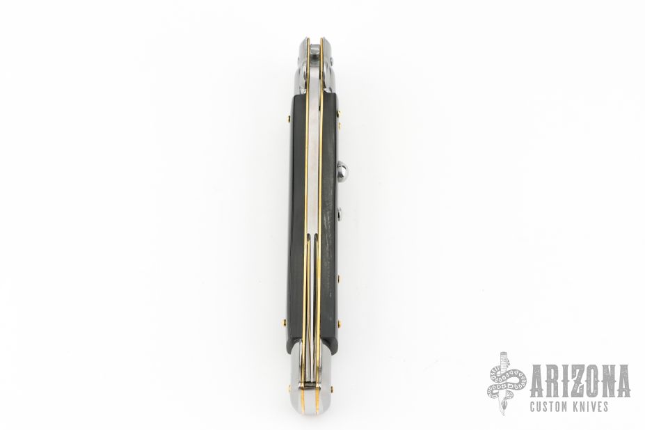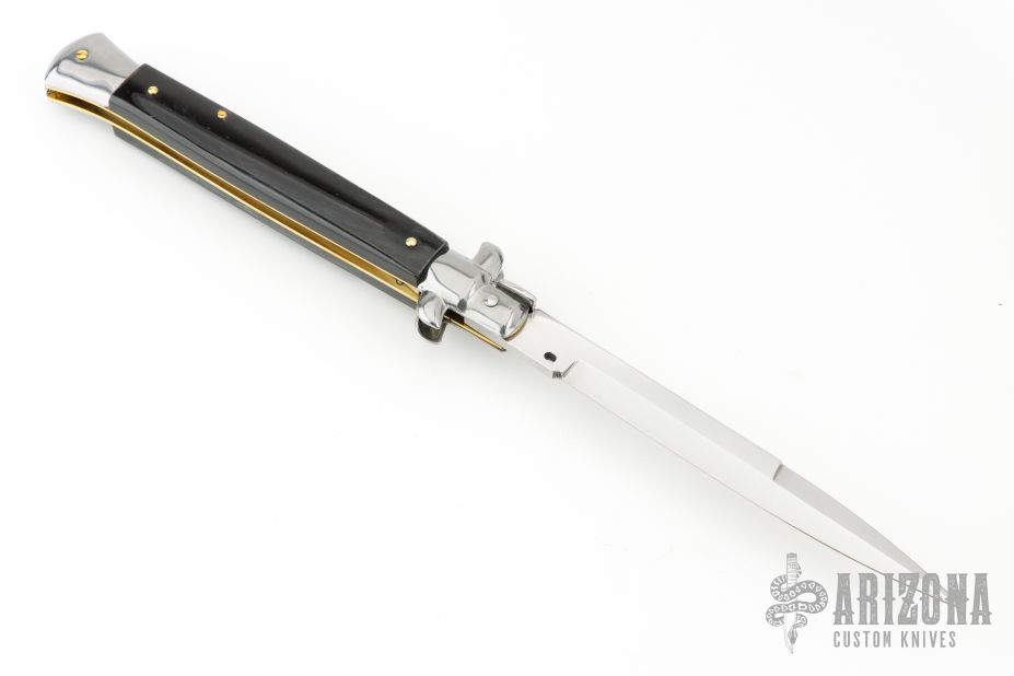 This Swivel Bolster Auto has a bayonet ground blade with false top edge. The handle is composed of a steel front and rear bolsters, brass liners all complemented by buffalo horn scales. Comes in Campolin leather sheath. Excellent condition.  This one was tuned and polished by Greg's Effects and has a COA.