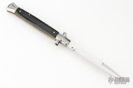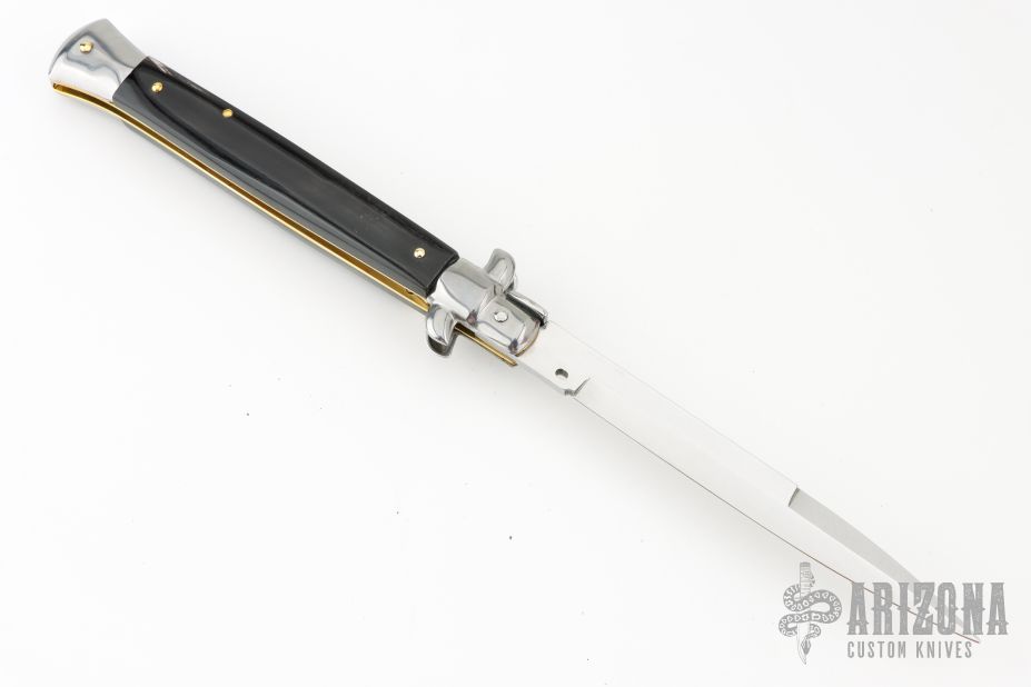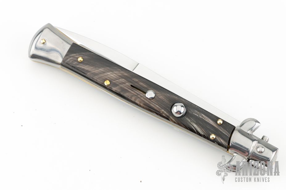 This Swivel Bolster Auto has a bayonet ground blade with false top edge. The handle is composed of a steel front and rear bolsters, brass liners all complemented by buffalo horn scales. Comes in Campolin leather sheath. Excellent condition.  This one was tuned and polished by Greg's Effects and has a COA.