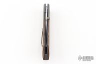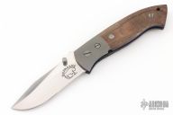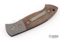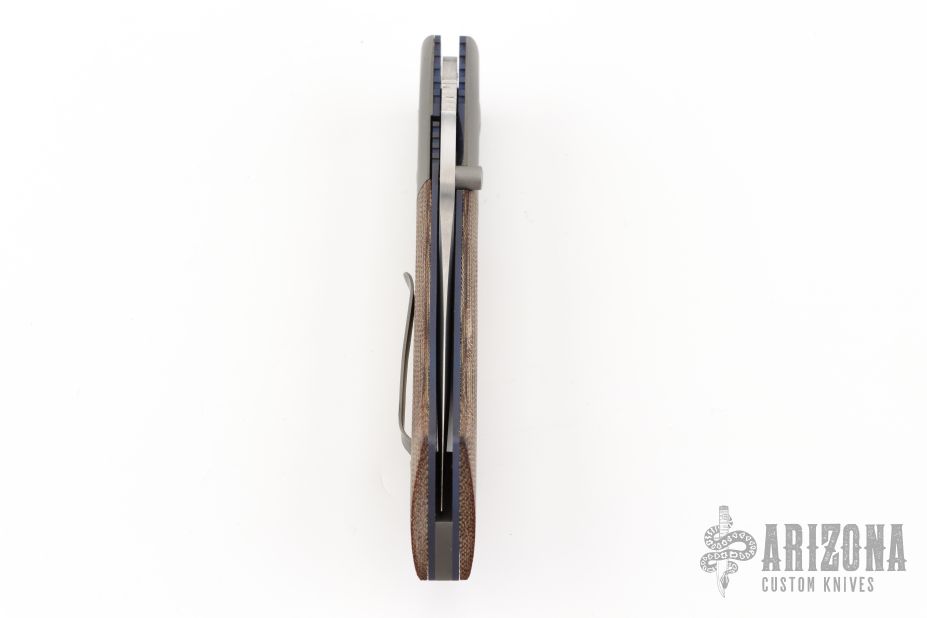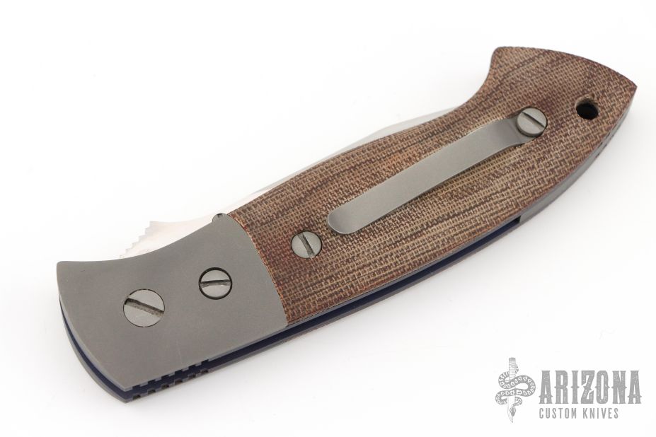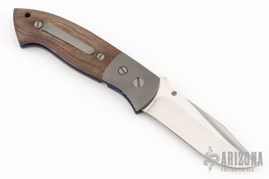 This linerlock folder by DB Fraley features a hand rub satin finished blade with a notched thumb ramp and a thumbstud. The handle has bead blasted and dovetailed titanium bolsters, brown canvas micarta scales, blasted and anodized titanium liners, bead blasted titanium backspacer and tip down clip. Nice detent and lockup. Has some light scratches, otherwise excellent condition. Comes with a zippered case.