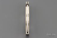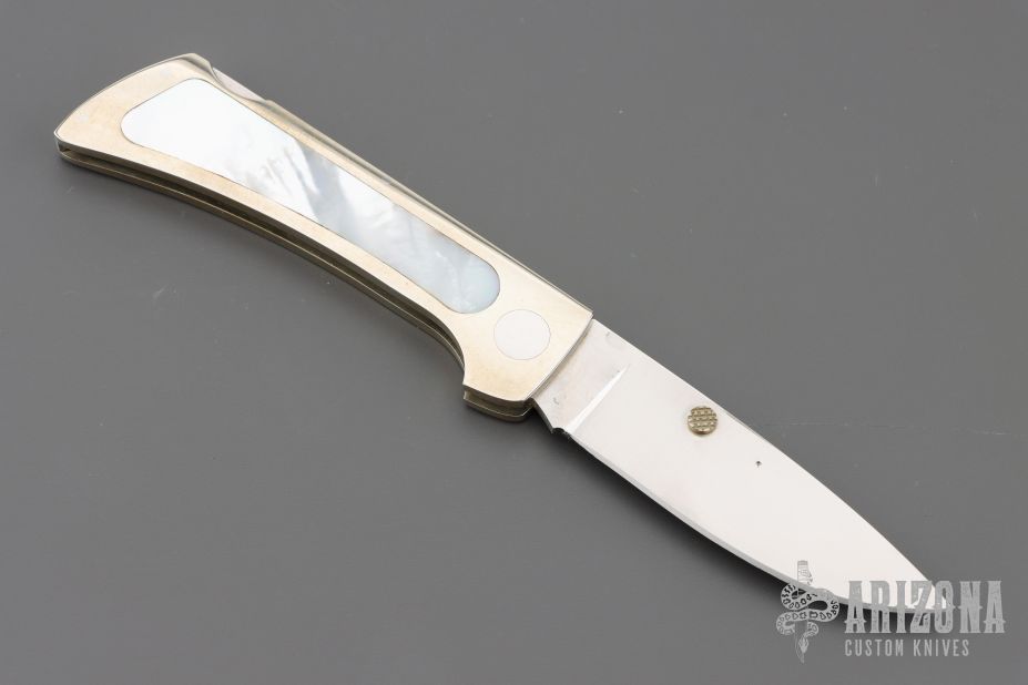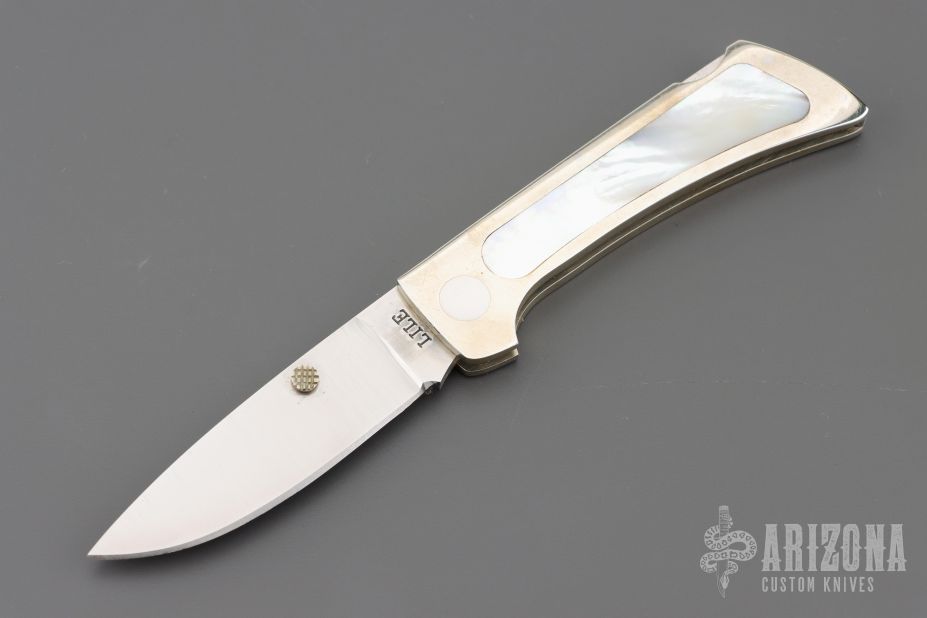This Lockback Folder by Jimmy Lile features a satin finished blade with dual checkered nickel silver thumbstuds. The handle has a nickel silver frame with mother of pearl inlays and stainless steel backspacer. Nice blade seating and lockup. Has some light scratches and a spot on the blade, otherwise good condition for its age. Comes with a zippered case.