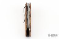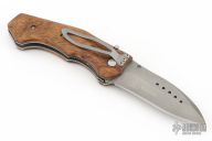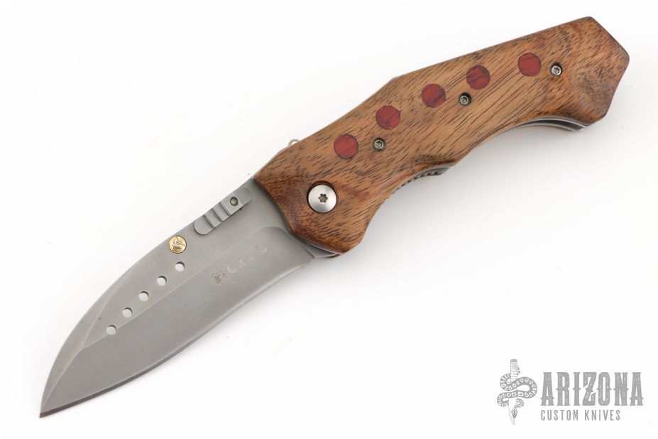 "The CRKT Scarab Knife, designed by acclaimed knifemaker Allen Elishewitz. This Scarab knife features a 3.25" modified spear point blade made of AUS8 stainless steel, .14" thick, with a Rockwell hardness of 58-59. The blade of this CRKT knife has a non reflective bead blast finish, a gold plated Elishewitz logo inset, a thumb stud and the OutBurst assist for one hand opening.