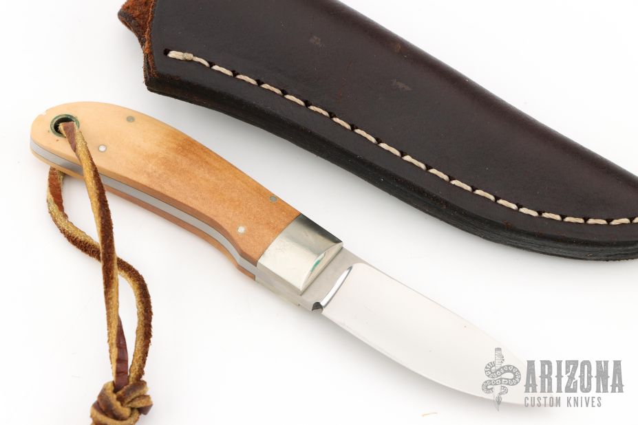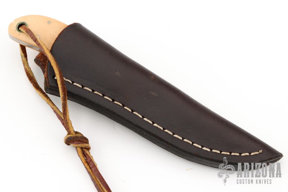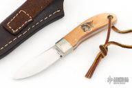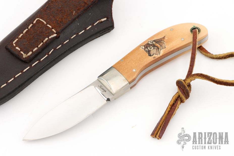 This knife by John Kemp features a polished drop point blade with .126" blade thickness and .697" blade depth, full tang construction. The handle has nickel silver bolsters, paper micarta scales with scrimshaw of a wolf signed "BB". Coems with black leather sheath. Excellent condition.