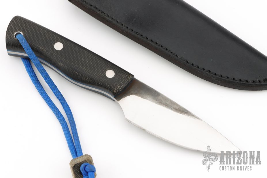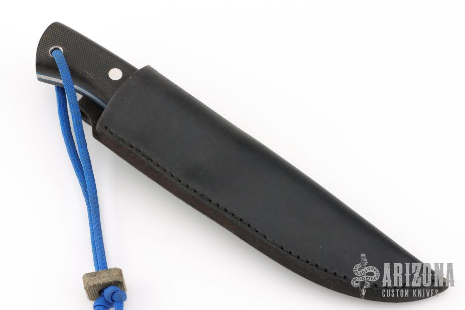This Knife by Ben Tendick features a satin finished blade with blade flats, .130" blade stock and 1.245" blade depth, full tang construction. The handle has black canvas micarta scales with blue liners. Comes with a black leather sheath. Has scratches, has been used, needs to be resharpened, good condition otherwise.
