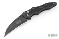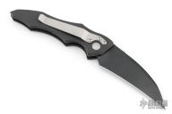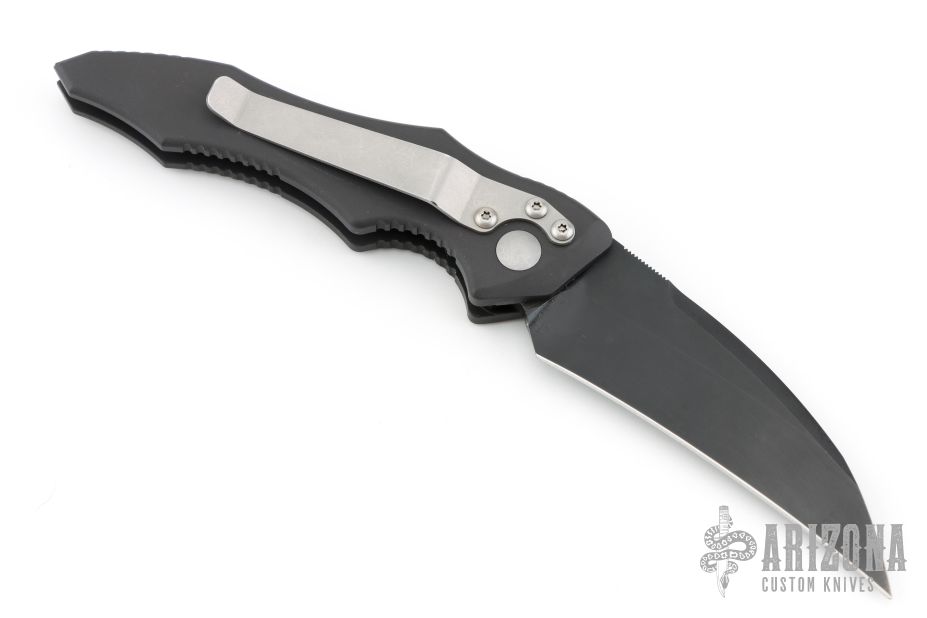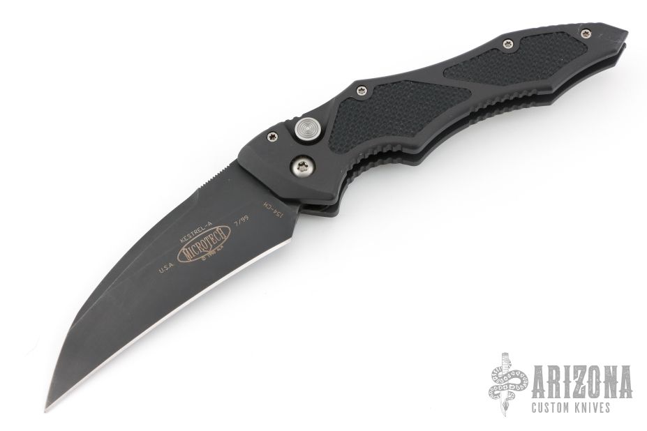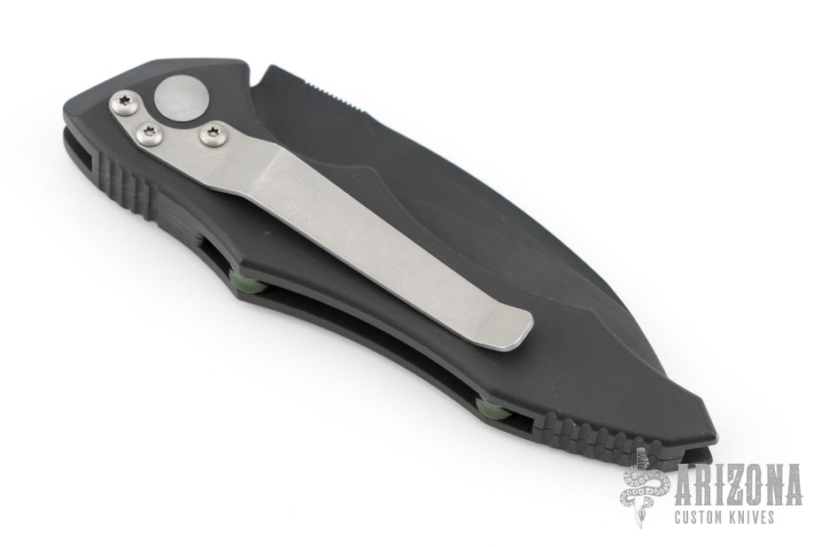 This Kestrel side-opening automatic by Microtech has a black plain edge blade and is dated 7/99. Stainless steel clip. Green posts. Handle features non-slip rubber inserts. Has some scuffs and scratches, great condition for its age.