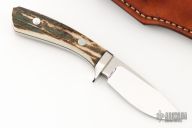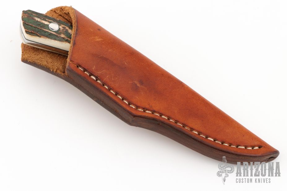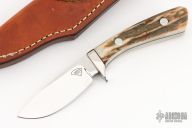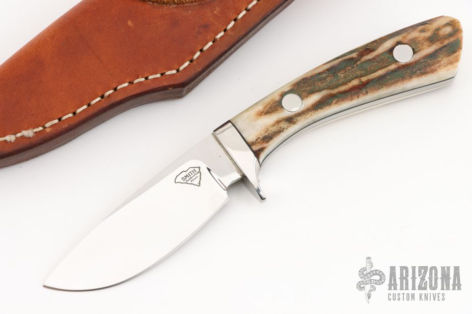 This Knife by Ralph Smith features a mirror finished drop point blade with .125" blade stock and .893" blade depth, full tang construction. The handle has a stainless steel guard with stag scales over black fiber liners. Includes a brown leather sheath with belt loop. Excellent Condition.