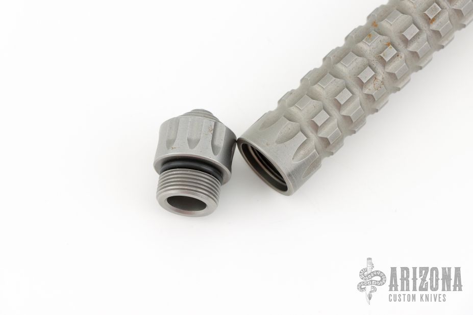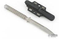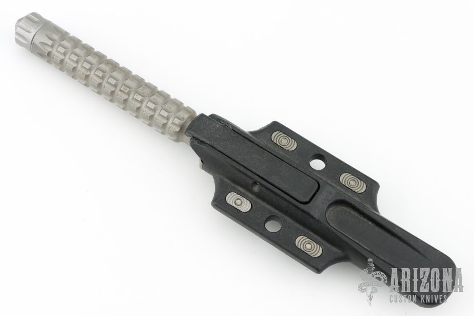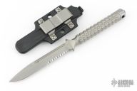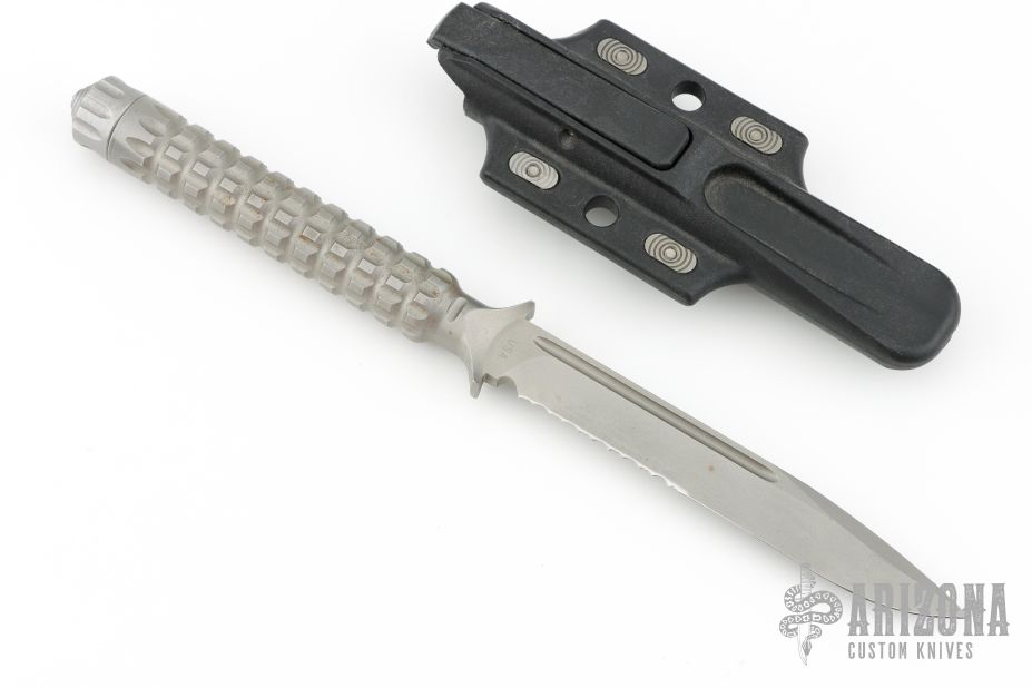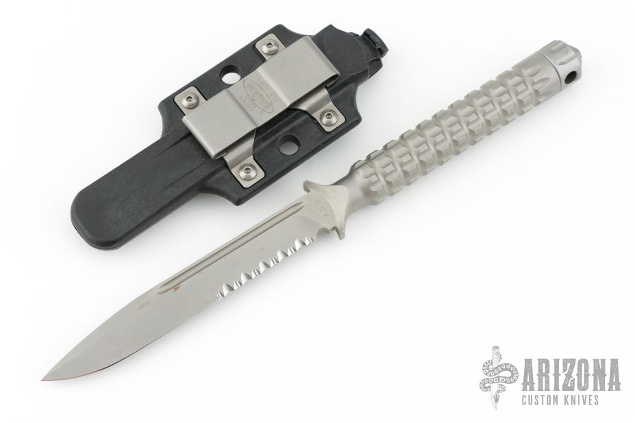 Tactical bead blast ADO made from a single steel billet. Bead blast single edge blade with partial serrations and textured handle. .178" Blade Stock. .647" Blade Depth. Removable end cap with small storage area. Sheath with belt clip dated 10/2016 S/N 3217. Has some scratches, scuffs, and patina. Good condition otherwise.